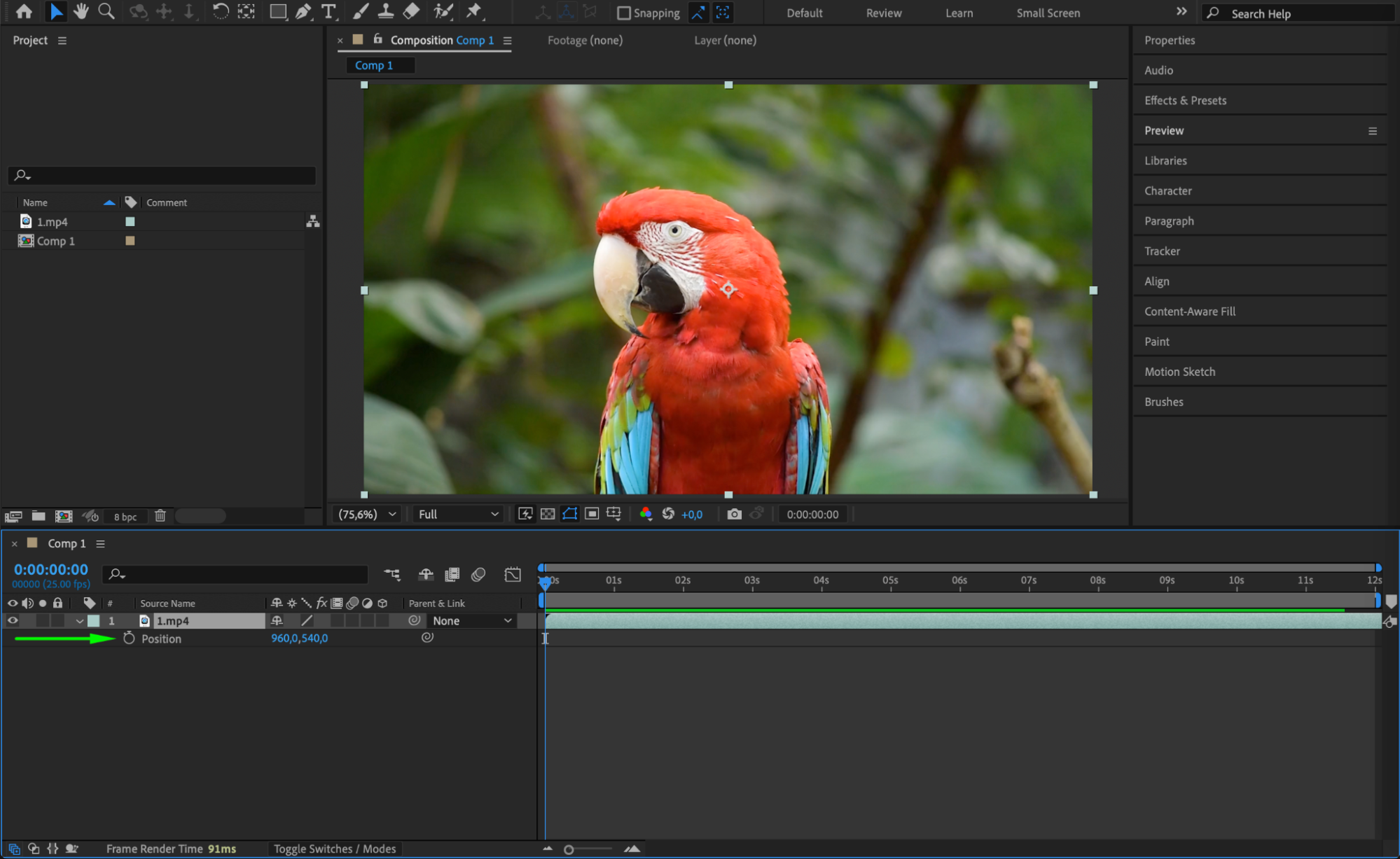After scaling, you might want to adjust the position slightly to center the image or video perfectly. Press “P” to reveal the Position property and drag the layer as needed.