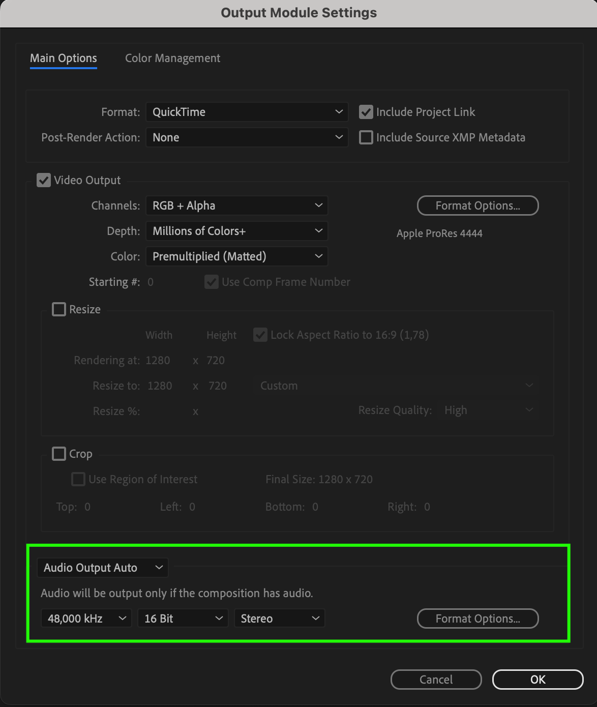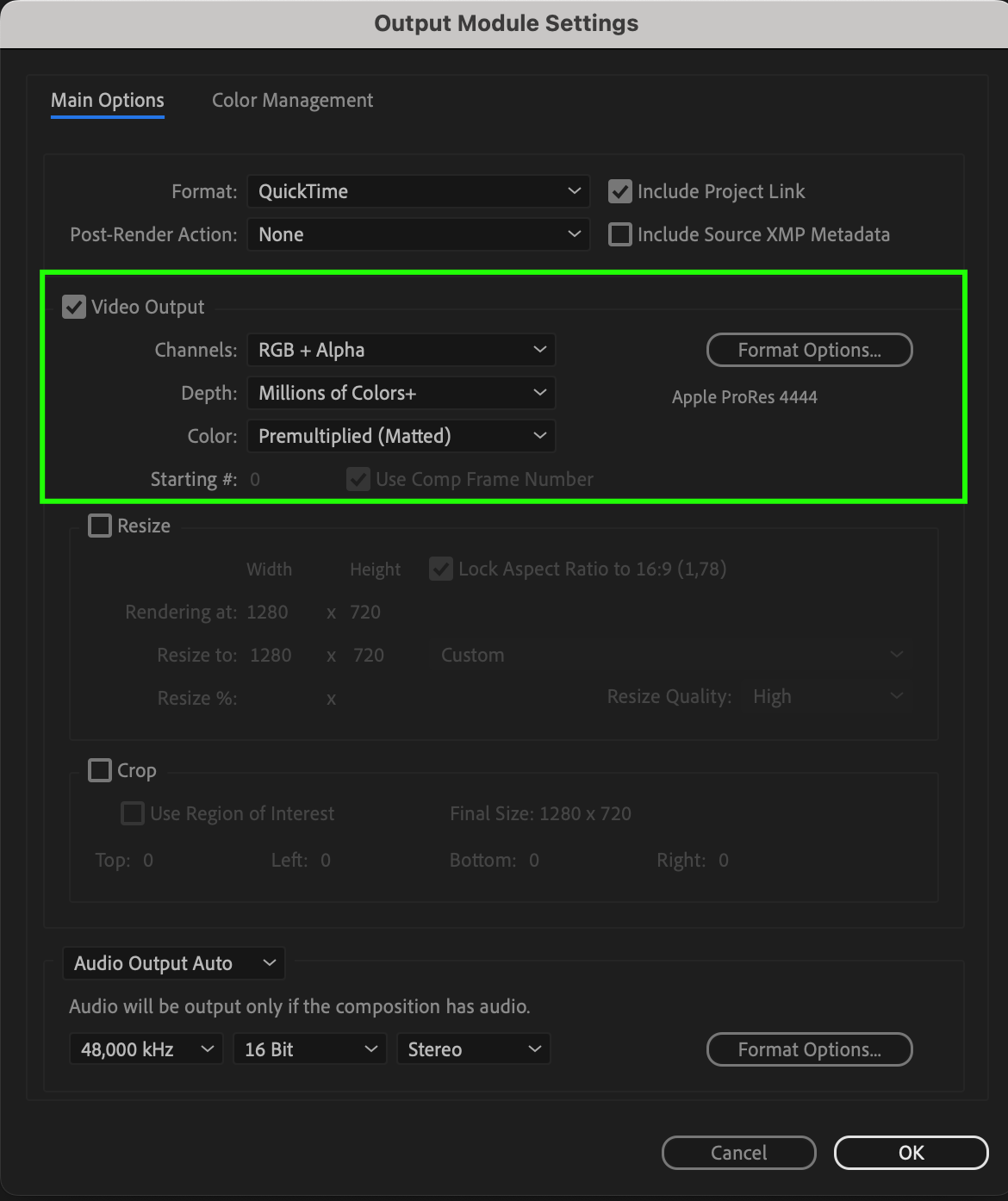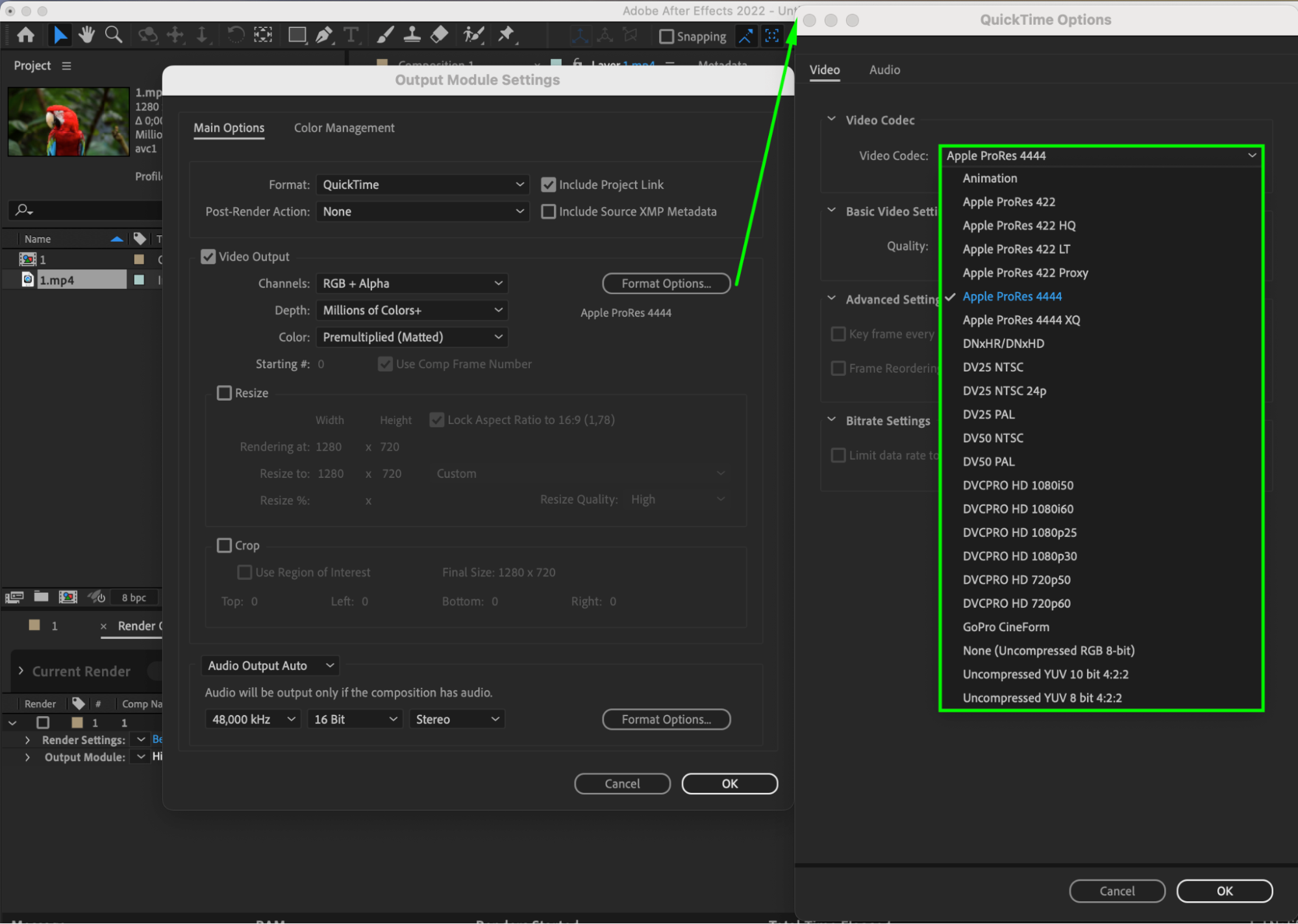 Click on “Format Options” and choose a video codec, such as Apple ProRes 4444. Its advantages include high-quality image and support for alpha channel for transparency.
