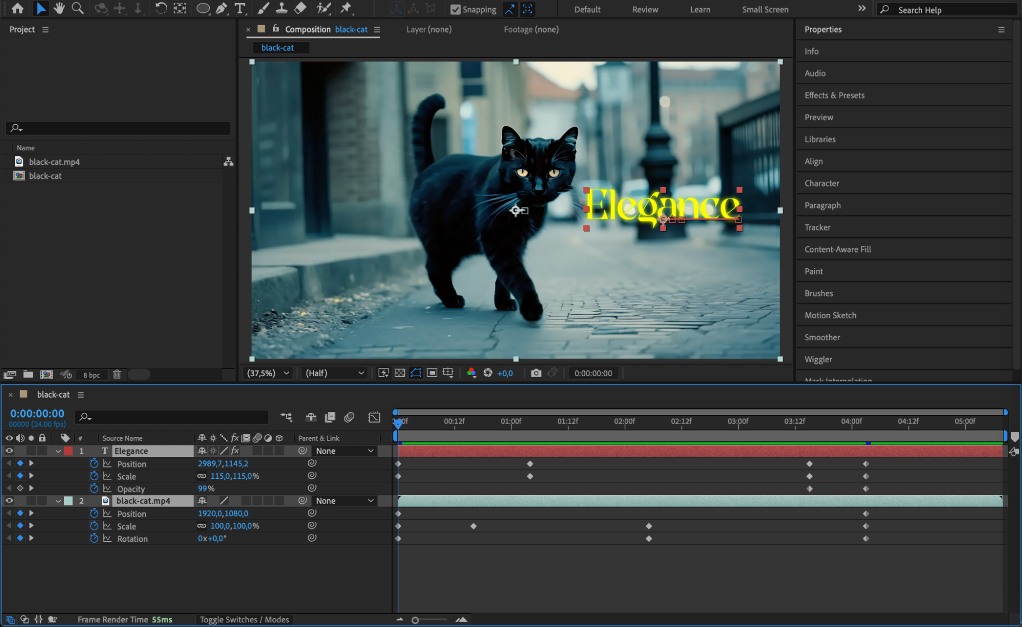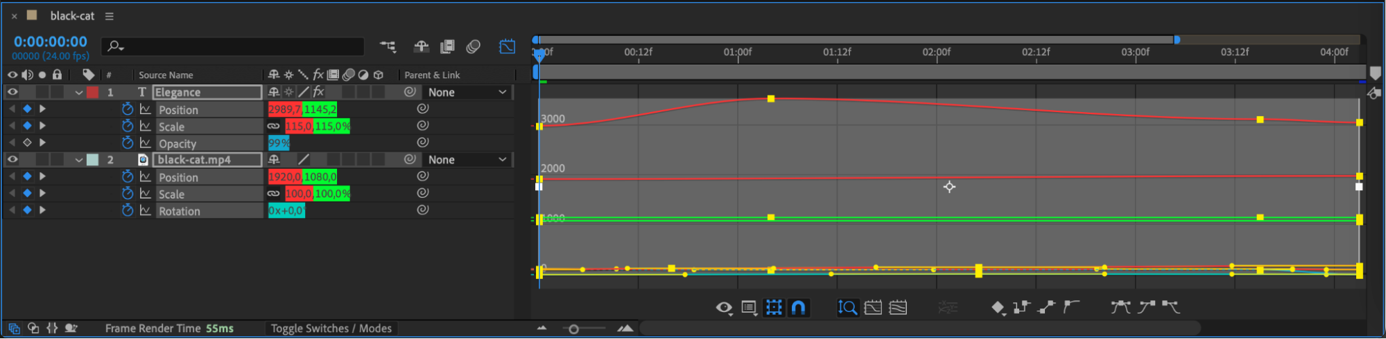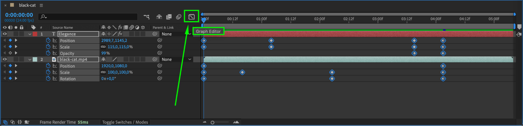 Once all keyframes are visible, you can easily move them, edit their values, or apply easing for smoother animations. Use the Graph Editor (by clicking the Graph Editor button) for more precise control over motion curves.