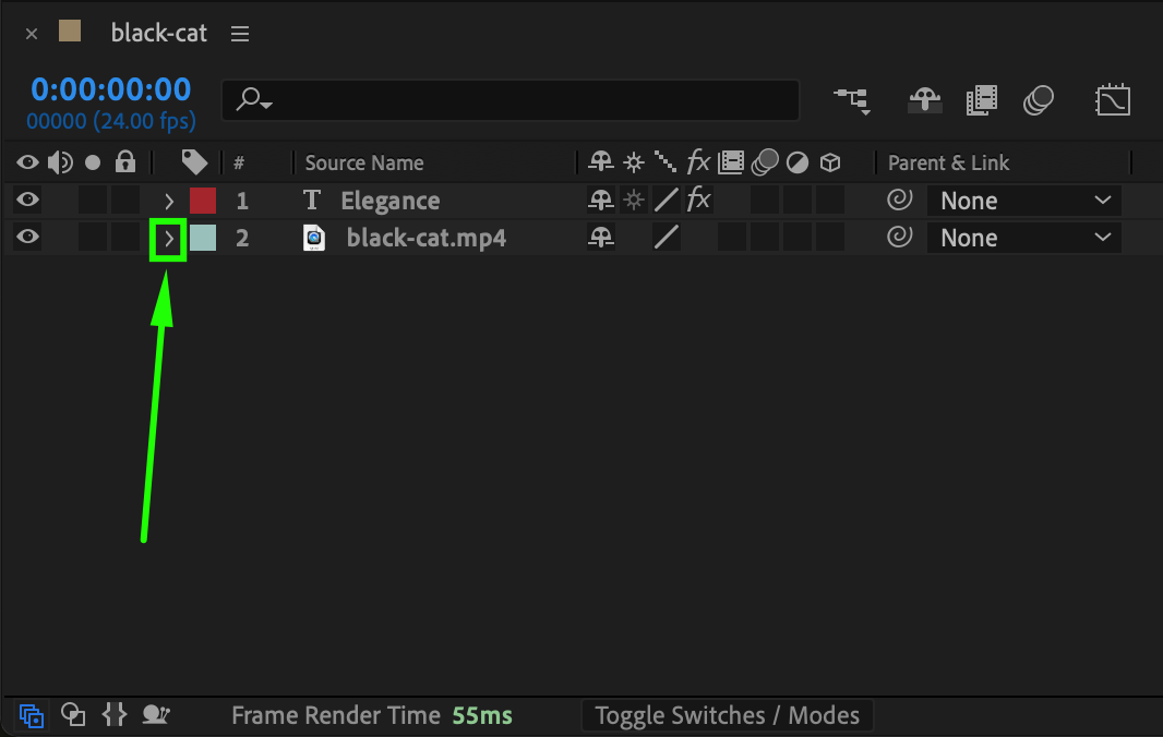 If you prefer to navigate manually, click the small triangle arrow next to a layer to expand its properties. Then, expand Transform, Effects, or Masks to find keyframed values like Position, Scale, Opacity, and more.