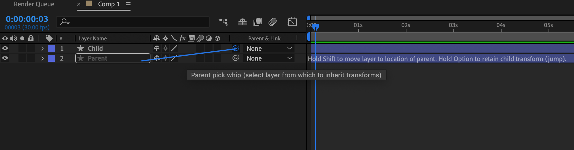 2. Once you’ve assigned the parent layer, you will notice a thin, blue line connecting the child layer to the parent layer in the Composition panel. This visual representation helps you identify the parent-child relationship.