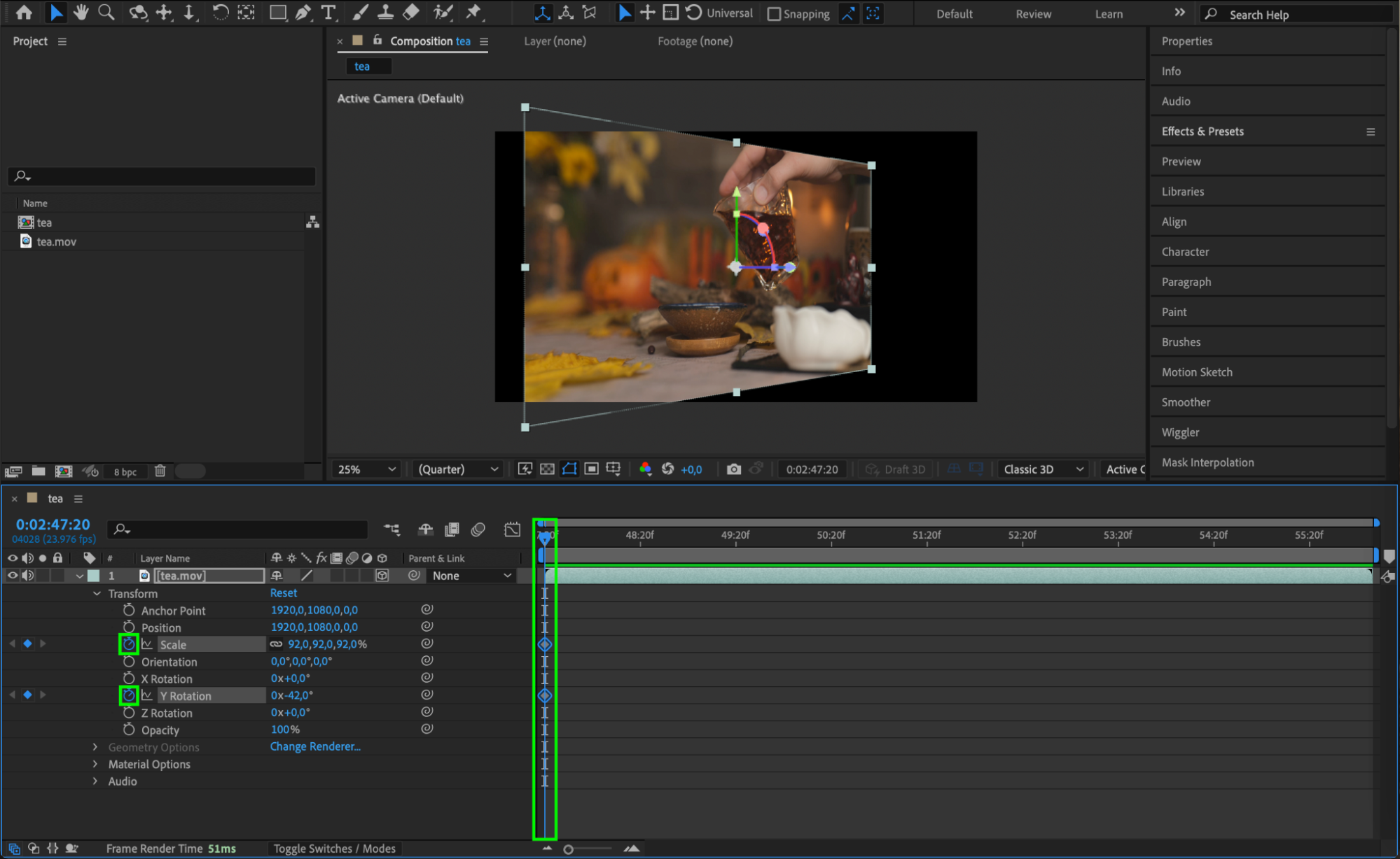 With the layer now a 3D object, open the transformation properties by pressing “R” to reveal rotation controls. Adjust the X Rotation, Y Rotation, and Z Rotation values to skew the video along the desired axis. You can also press “S” to adjust the scale, creating a perspective effect.