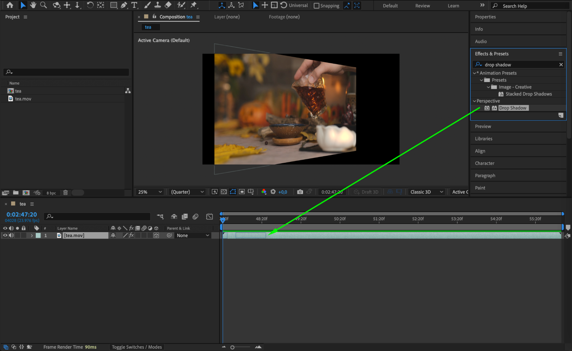 Enhance the visual impact of your skewed video by applying effects. Go to the Effects & Presets panel and choose effects like Drop Shadow, Glow, or others to complement your skew. Drag and drop the effects onto your layer and adjust the parameters in the Effect Controls panel.