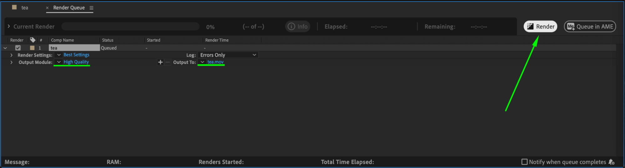 Once you’re satisfied with the result, render the composition. Go to Composition > Add to Render Queue, configure your output settings, and click Render to export your project.