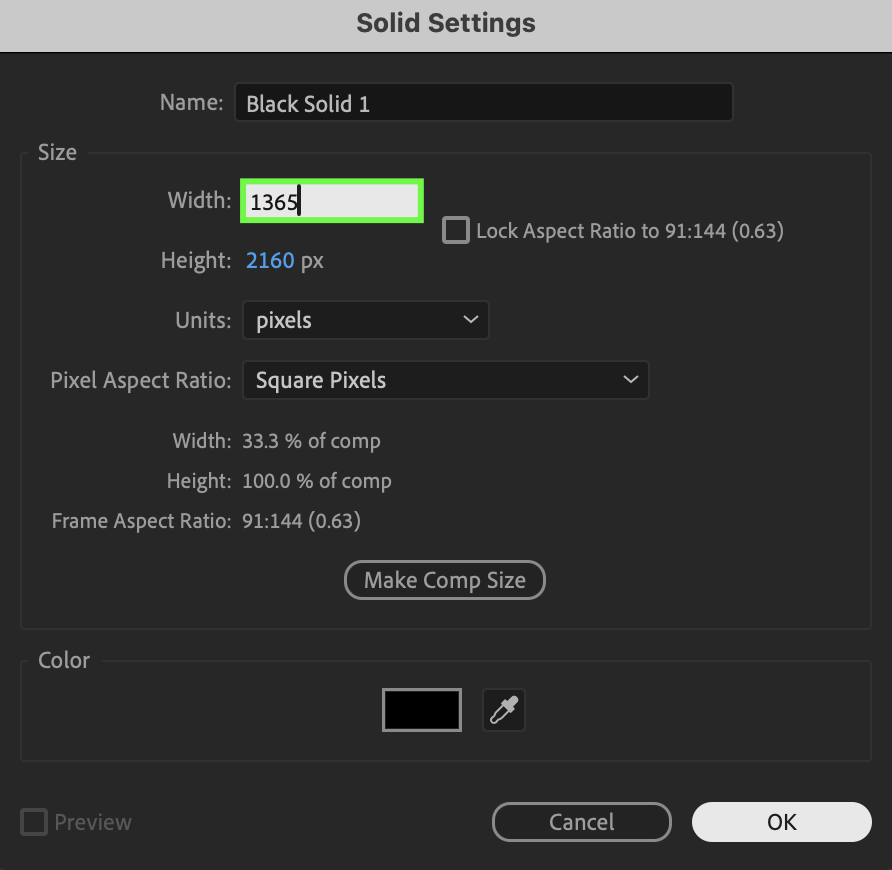 Go to Layer → New → Solid and create three (or more) solids. Each solid should be the same size and together fully cover the composition. Example for a 4096 × 2160 video sliced into 3 vertical sections: