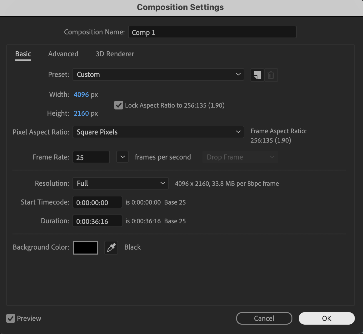Create a new composition that matches your video settings (for example, 4096 × 2160).