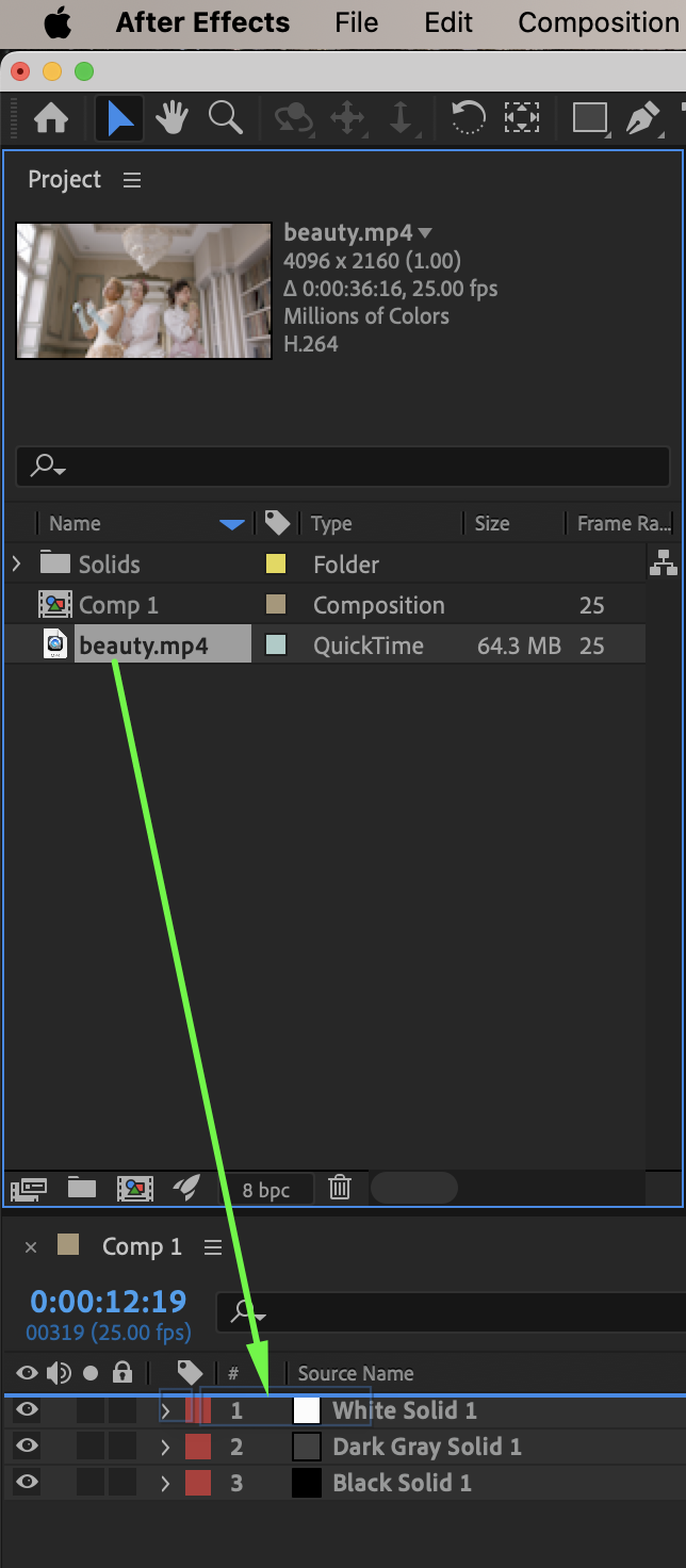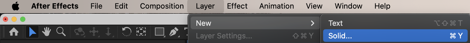 Go to Layer → New → Solid and create three (or more) solids. Each solid should be the same size and together fully cover the composition. Example for a 4096 × 2160 video sliced into 3 vertical sections: