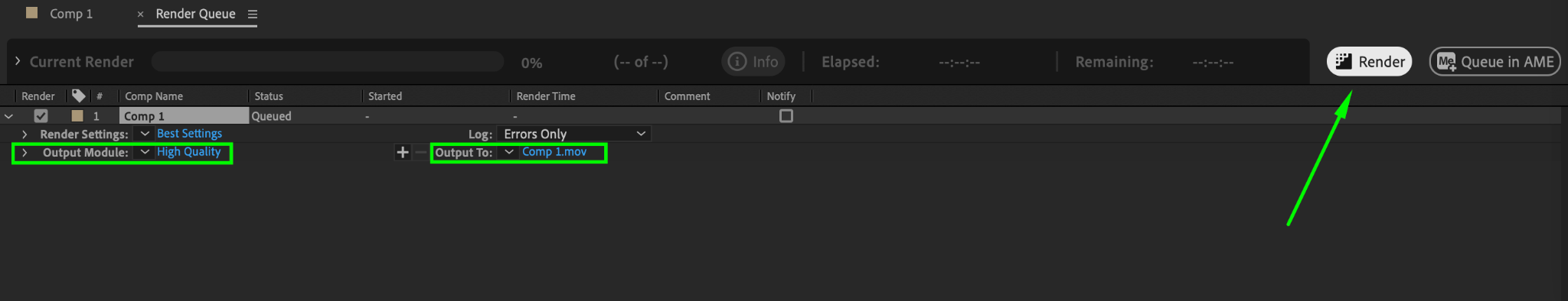 Click “Render” and choose rendering settings. Press “Add to Render Queue” and then “Render.”