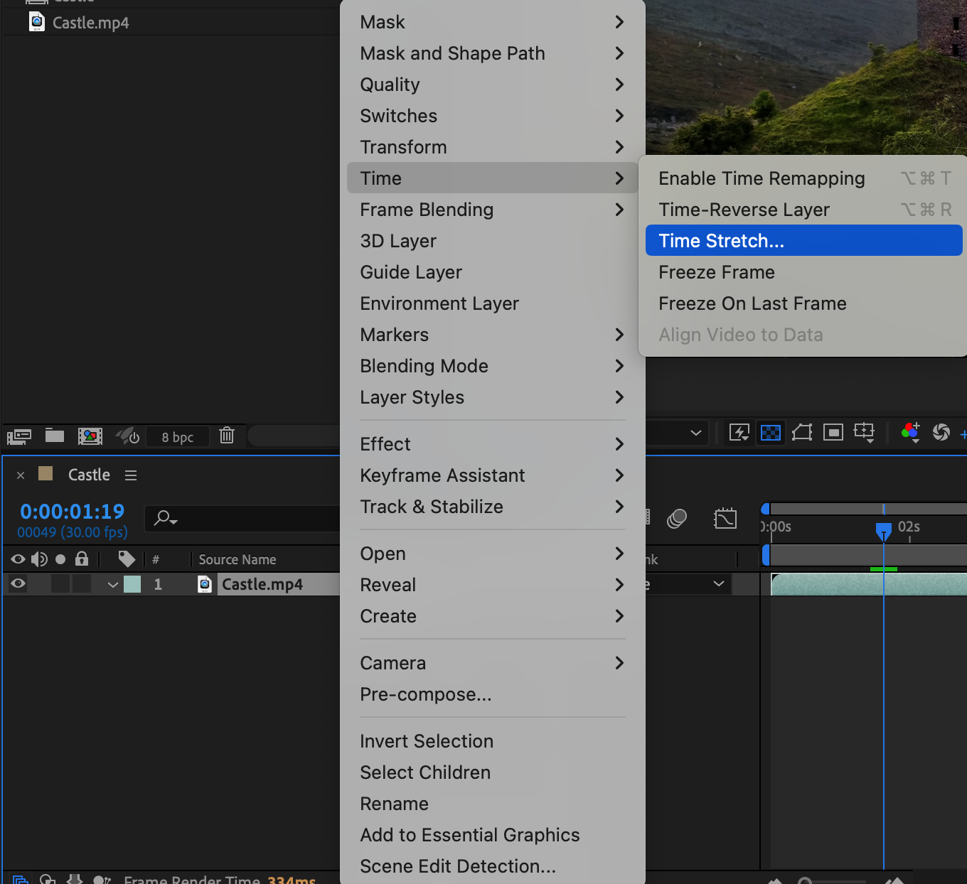 Another method to slow down footage is by adjusting the speed duration of your clips. This method is particularly useful when you want to extend the duration of a specific scene or shot. Select the video layer on the timeline, right-click on it, and from the submenu, choose “Time” > “Time Stretch”. In the dialog box that appears, set a new duration percentage for the layer: a value greater than 100% will slow down the video. After entering the desired value, click “OK”, and the layer will adjust its duration accordingly. Time Stretch allows precise control over the playback speed of the video while maintaining synchronization with other elements of the composition.