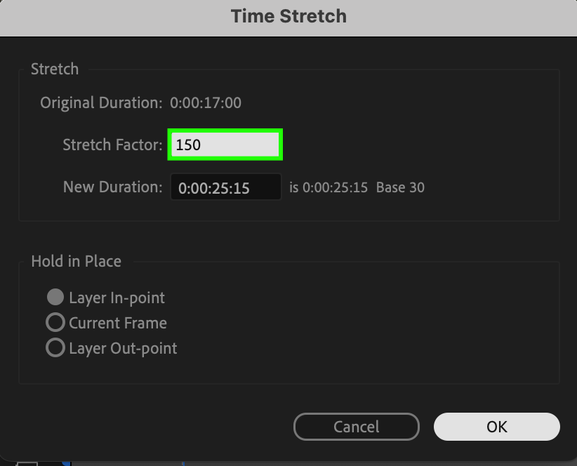 Another method to slow down footage is by adjusting the speed duration of your clips. This method is particularly useful when you want to extend the duration of a specific scene or shot. Select the video layer on the timeline, right-click on it, and from the submenu, choose “Time” > “Time Stretch”. In the dialog box that appears, set a new duration percentage for the layer: a value greater than 100% will slow down the video. After entering the desired value, click “OK”, and the layer will adjust its duration accordingly. Time Stretch allows precise control over the playback speed of the video while maintaining synchronization with other elements of the composition.