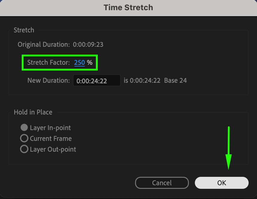 These steps will effectively time-stretch your video with the specified settings in Adobe After Effects.