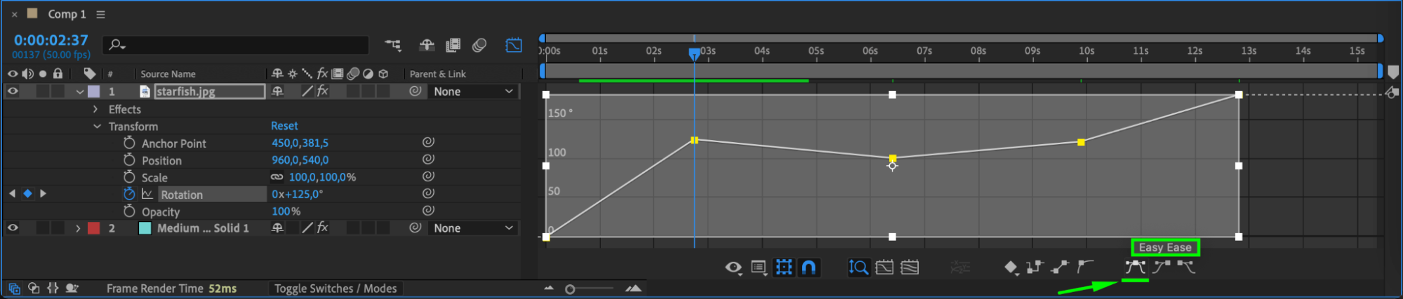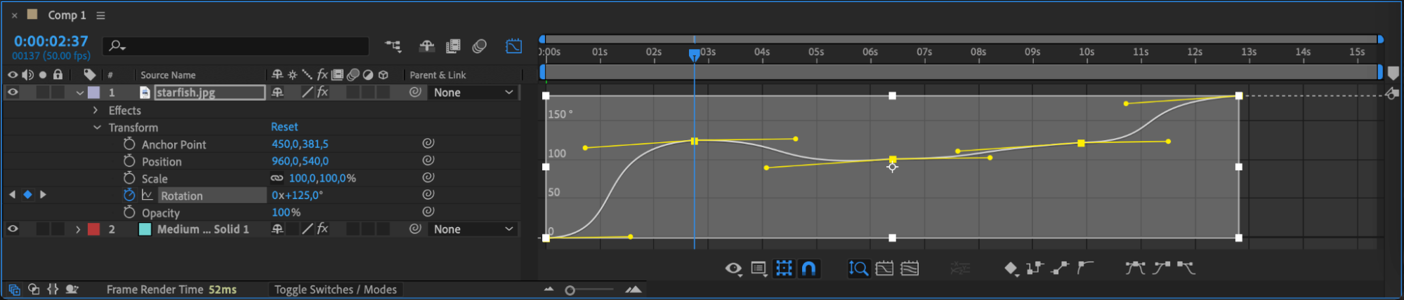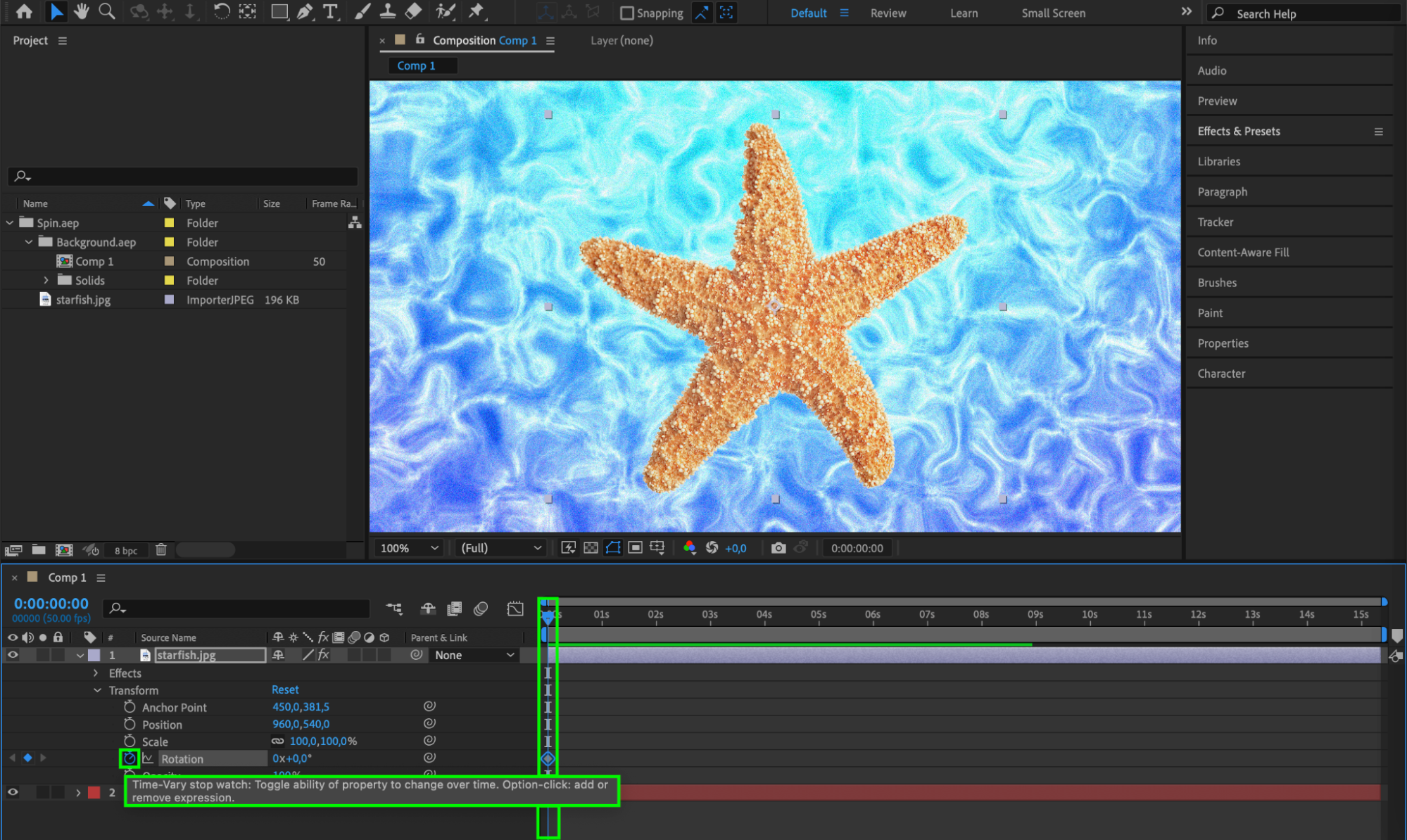 To start the spinning animation, set your first keyframe for the rotation property of the object. This keyframe will mark the beginning of the rotation. Select the layer, press “R” to reveal the rotation property, and click the stopwatch icon to create the first keyframe.
