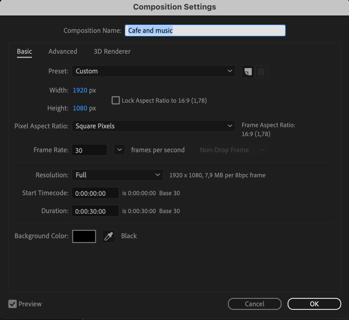 Set up a new composition with the desired settings.