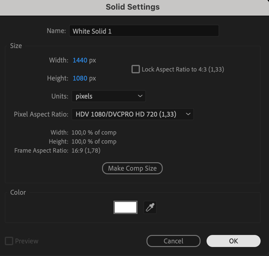 From the menu, choose Layer > New > Solid. Name this solid and set its color to white or any other preferred color. This solid will act as a placeholder for positioning your video clips.