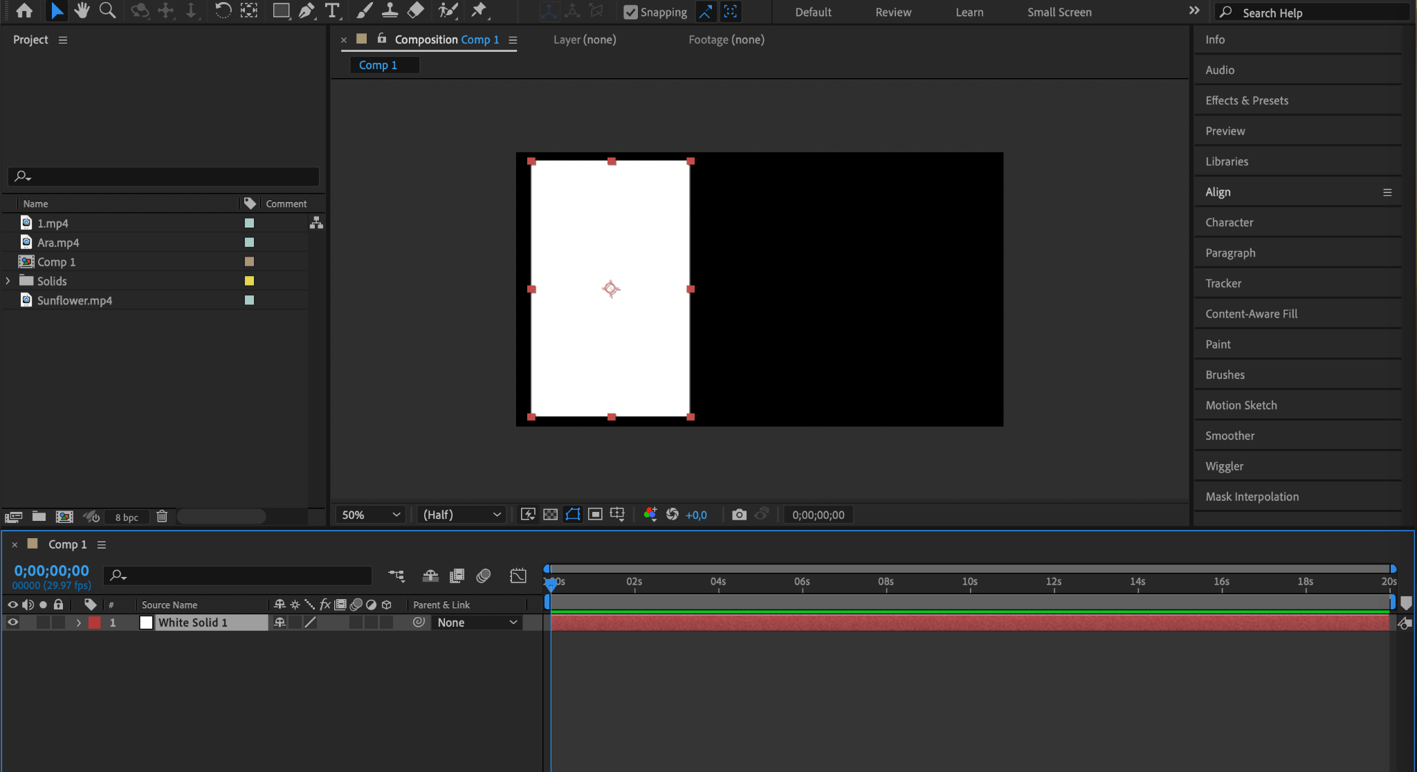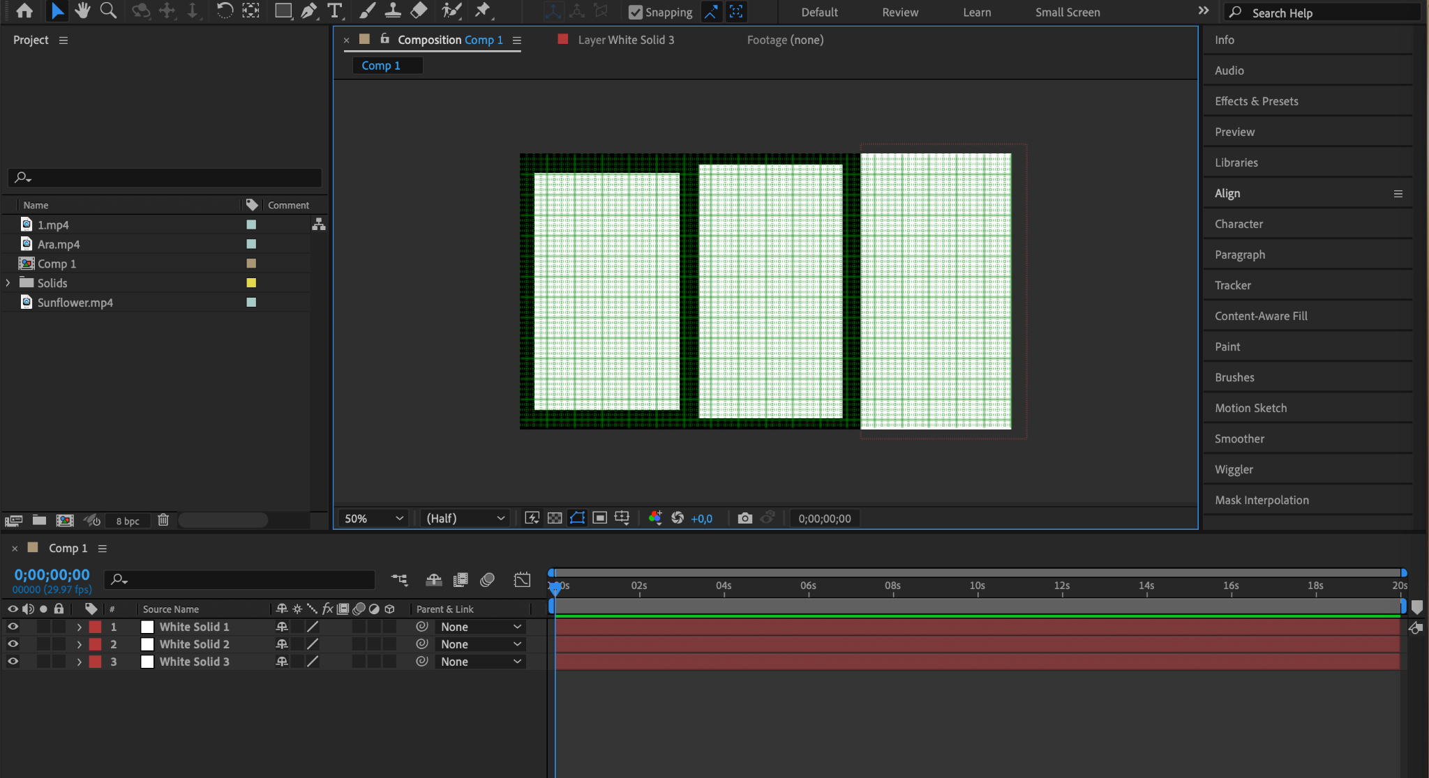 Place your solid on the composition panel where you want your split screen to appear. Use the Grid button at the bottom of the composition panel to align it correctly. Repeat the process of creating and positioning solids for each video file in your project panel.