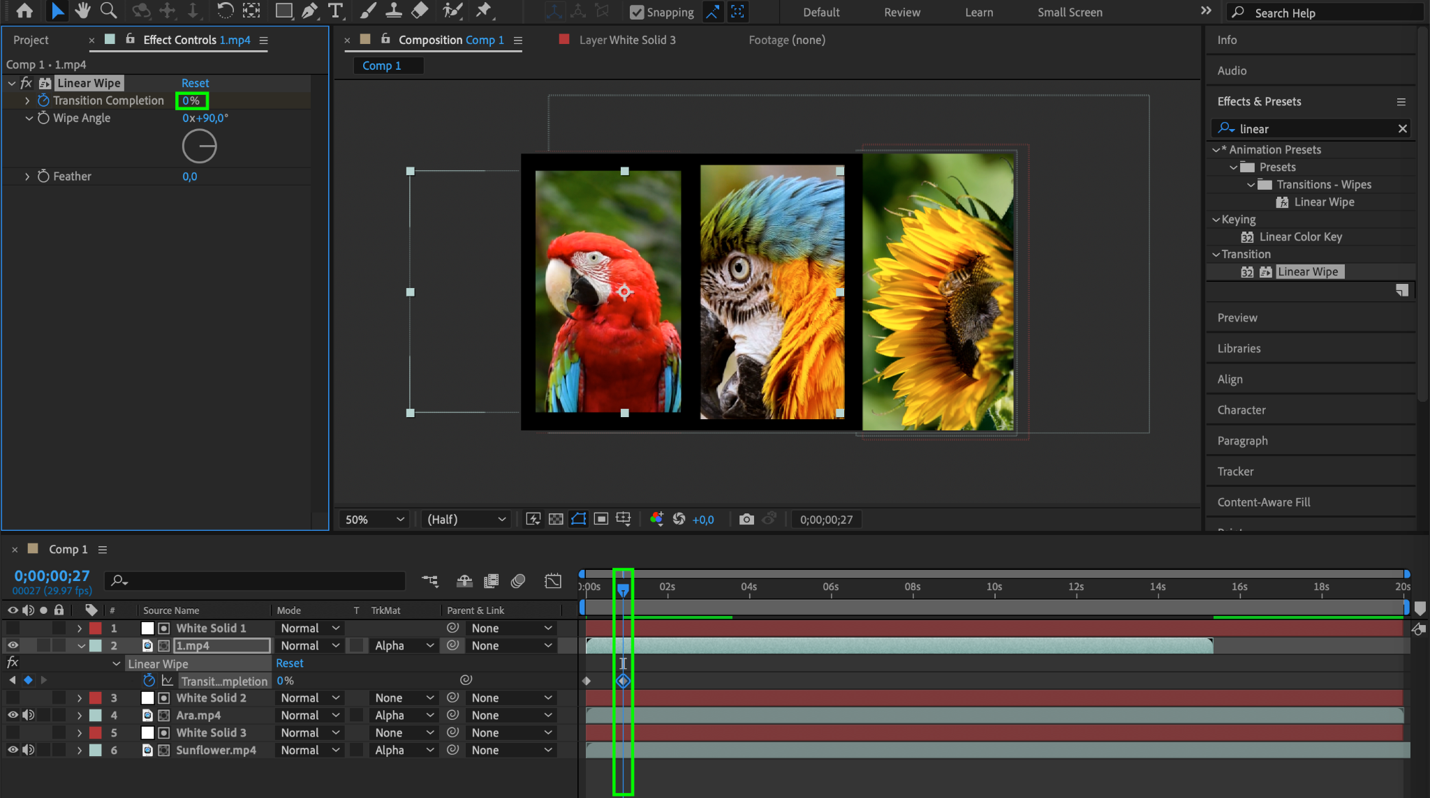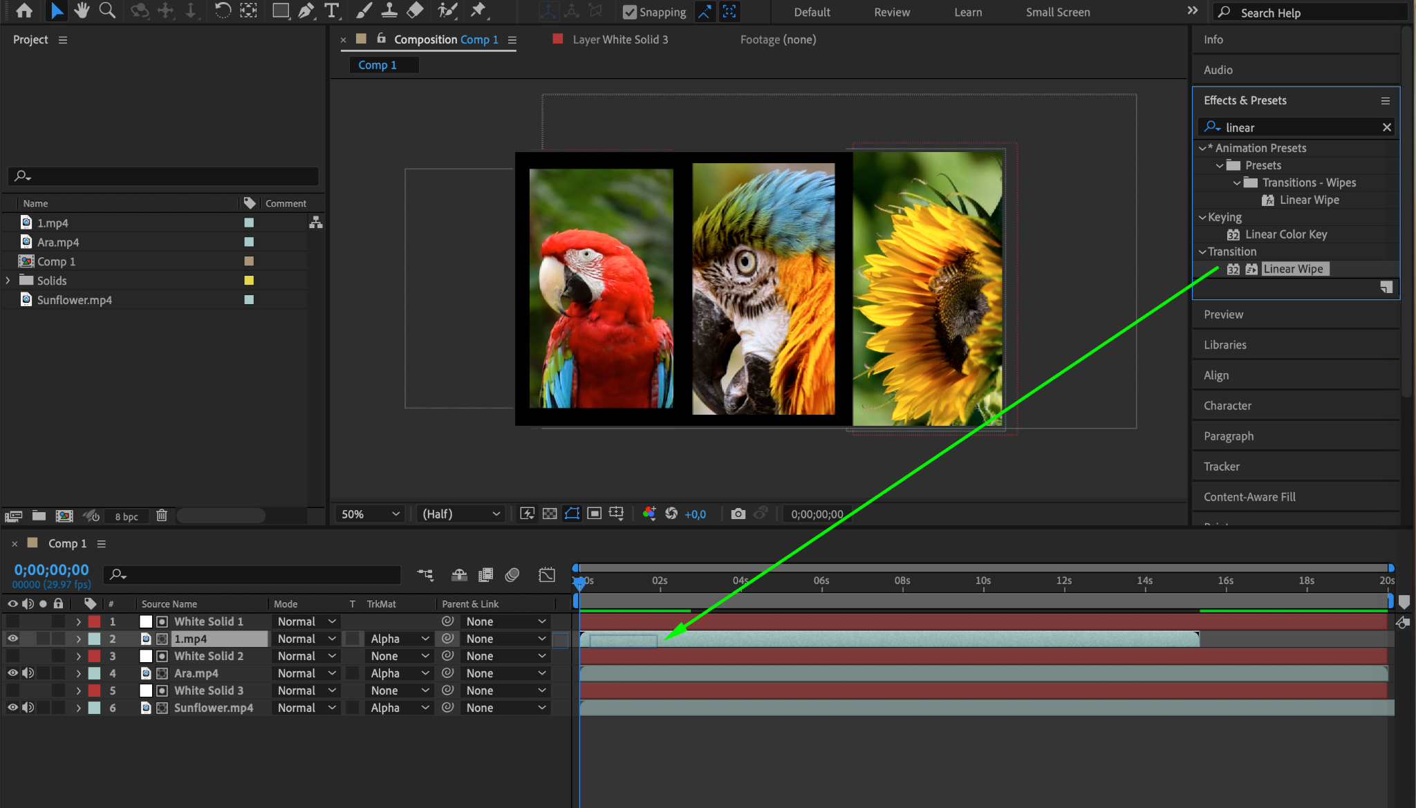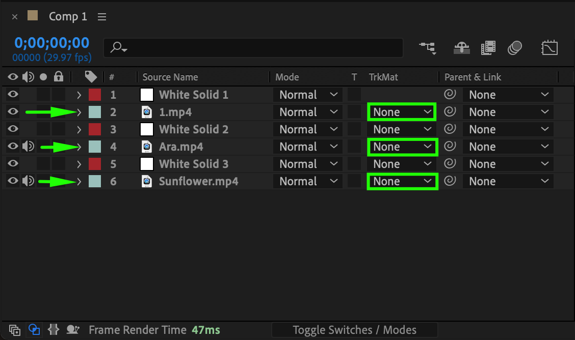 Drag each video file from the project panel to the timeline, placing it under the corresponding solid. This will position each video layer according to the solids you created.