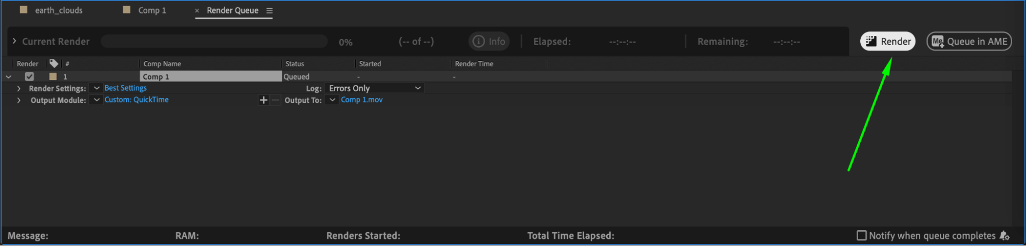 When you’re ready to render, click the Render button located on the far right of the Render Queue panel. The rendering process will begin. Depending on the complexity of your composition and your chosen settings, rendering may take anywhere from a few minutes to several hours. You can monitor the progress through the progress bar.