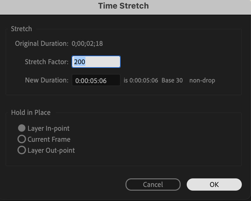 Select the layer and navigate to “Layer” > “Time” > “Time Stretch.”