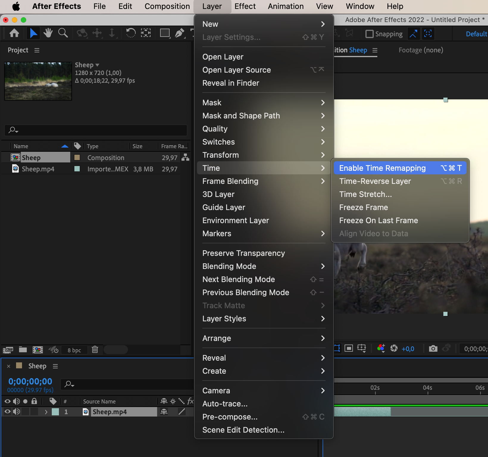 Select the layer and navigate to “Layer” > “Time” > “Enable Time Remapping.”