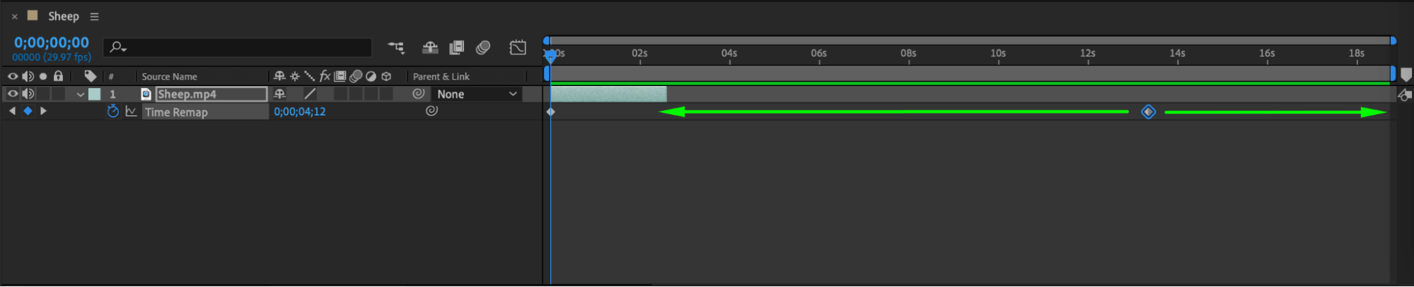 In the Time Remap section, at the end of the video layer on the timeline panel, an automatic keyframe is created. Using the stopwatch icon, create a keyframe at the beginning of the composition.