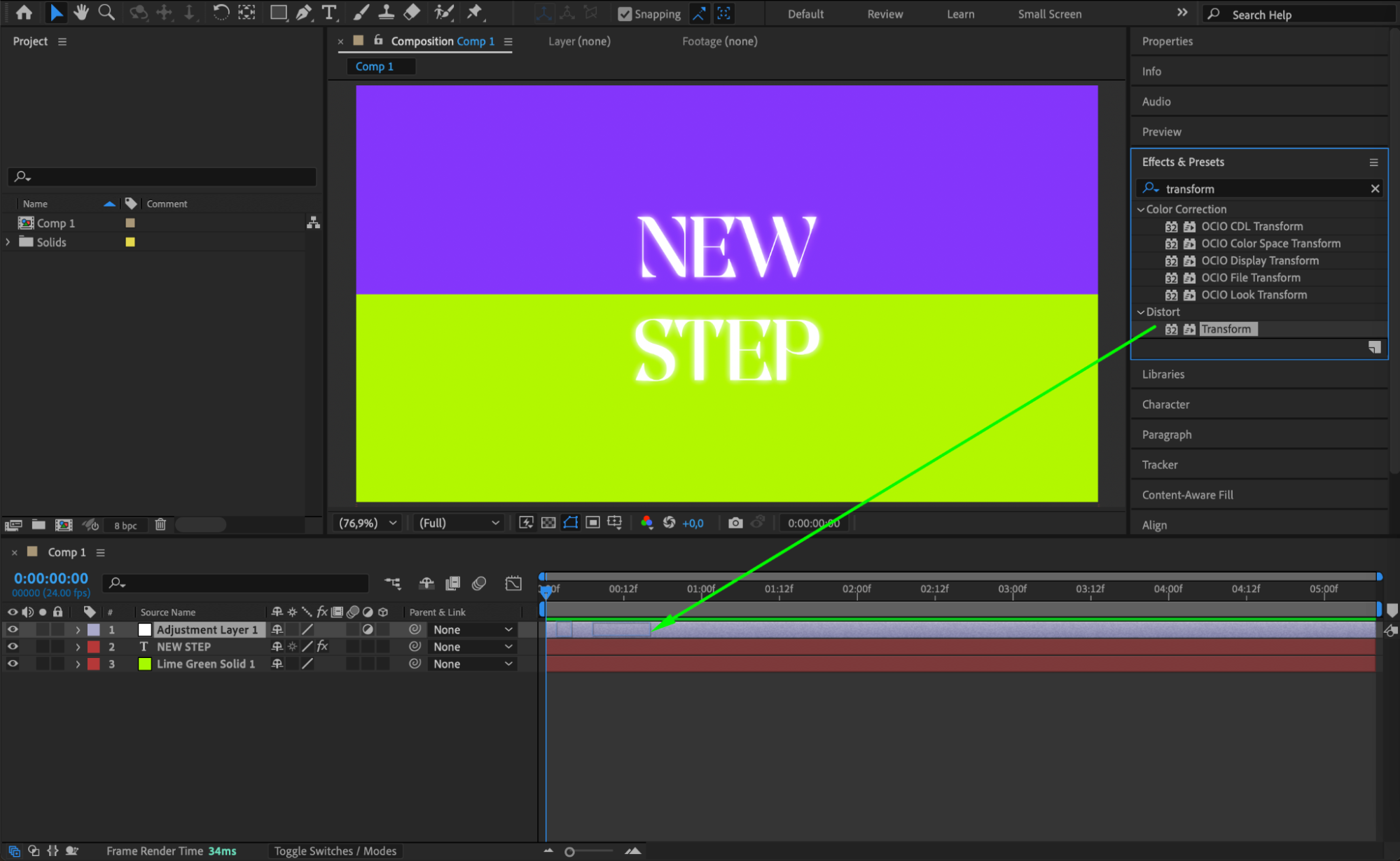With the Adjustment Layer selected, open the Effects & Presets panel and search for Transform. Drag and drop the effect onto the adjustment layer.