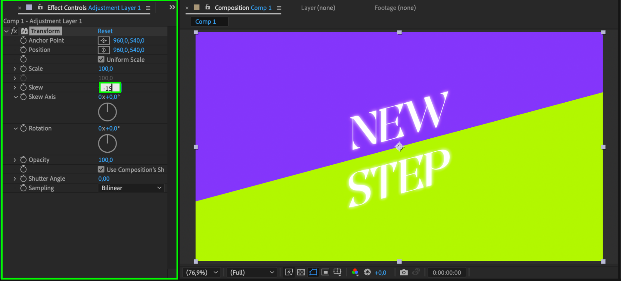 Press Spacebar to preview your composition. If needed, fine-tune the Skew value for the desired tilt. You can also animate the Skew property over time for a more dynamic effect.