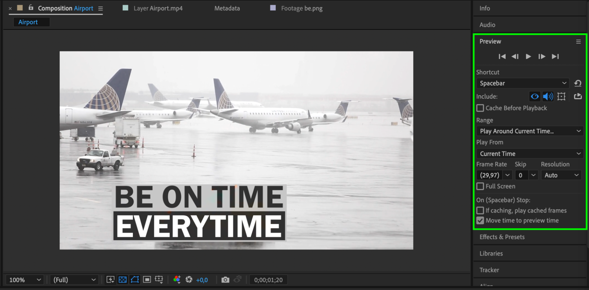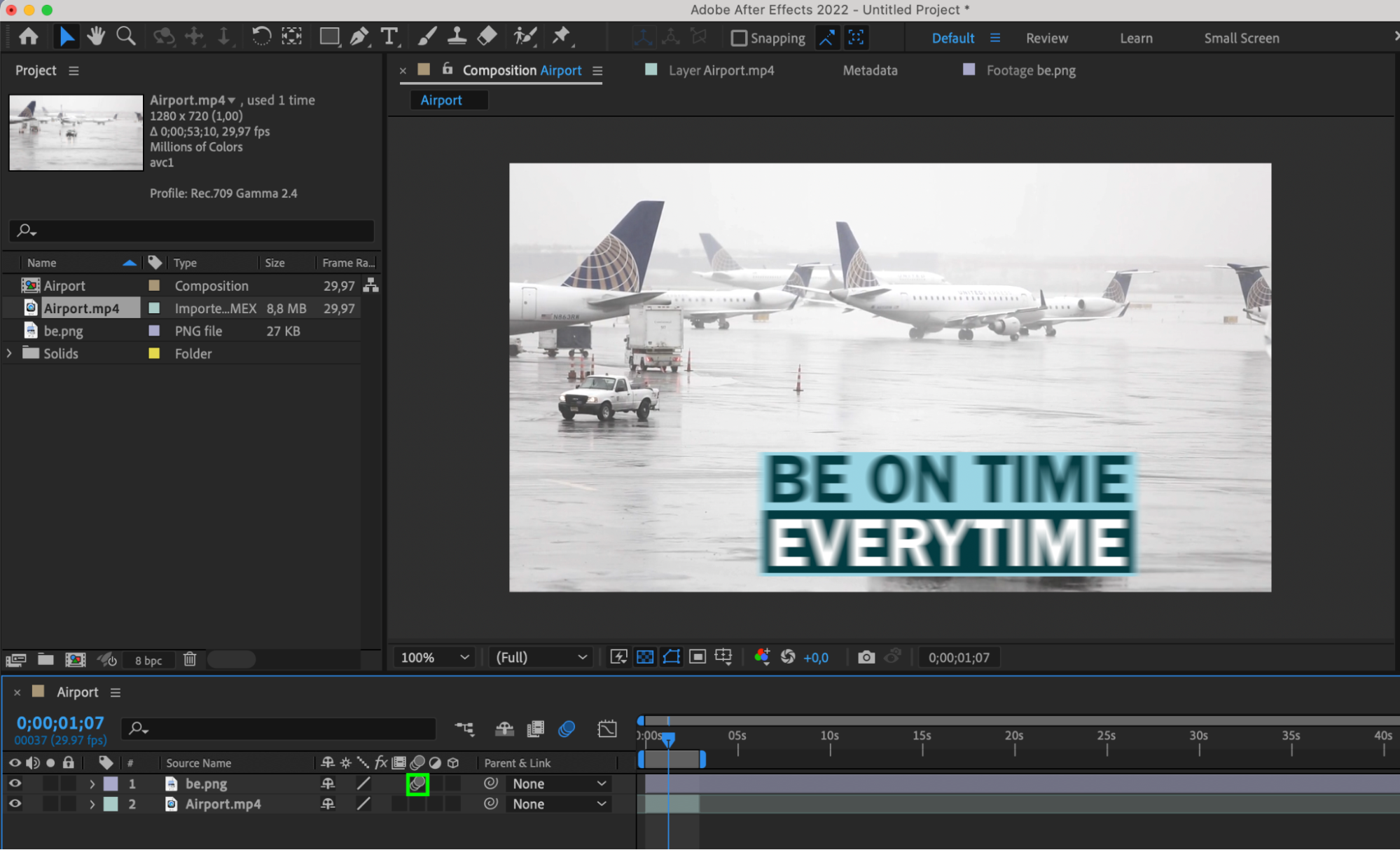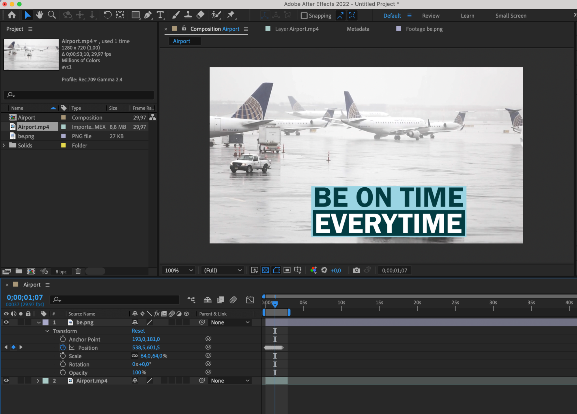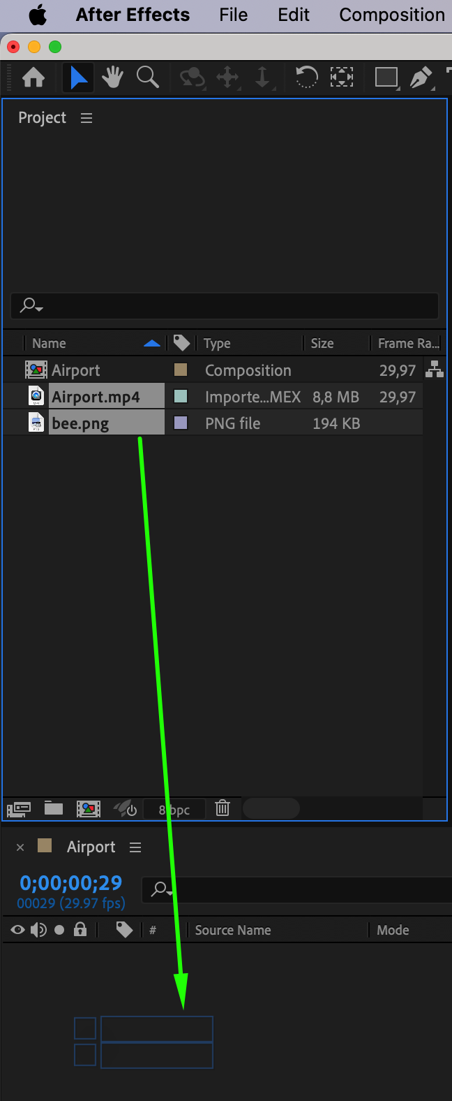 Create a composition and adjust its settings. Drag the imported files onto the composition panel.