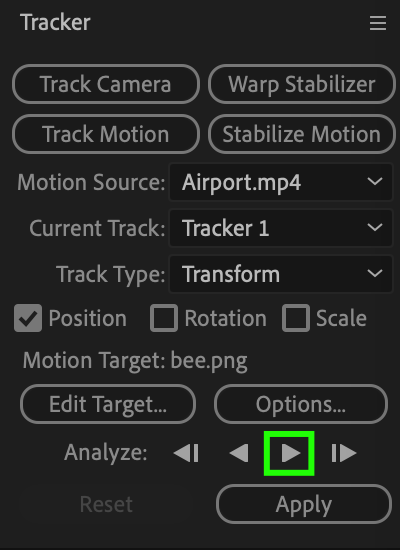 Select your video layer on the timeline panel, then choose “Track Motion” from the tracker panel menu.