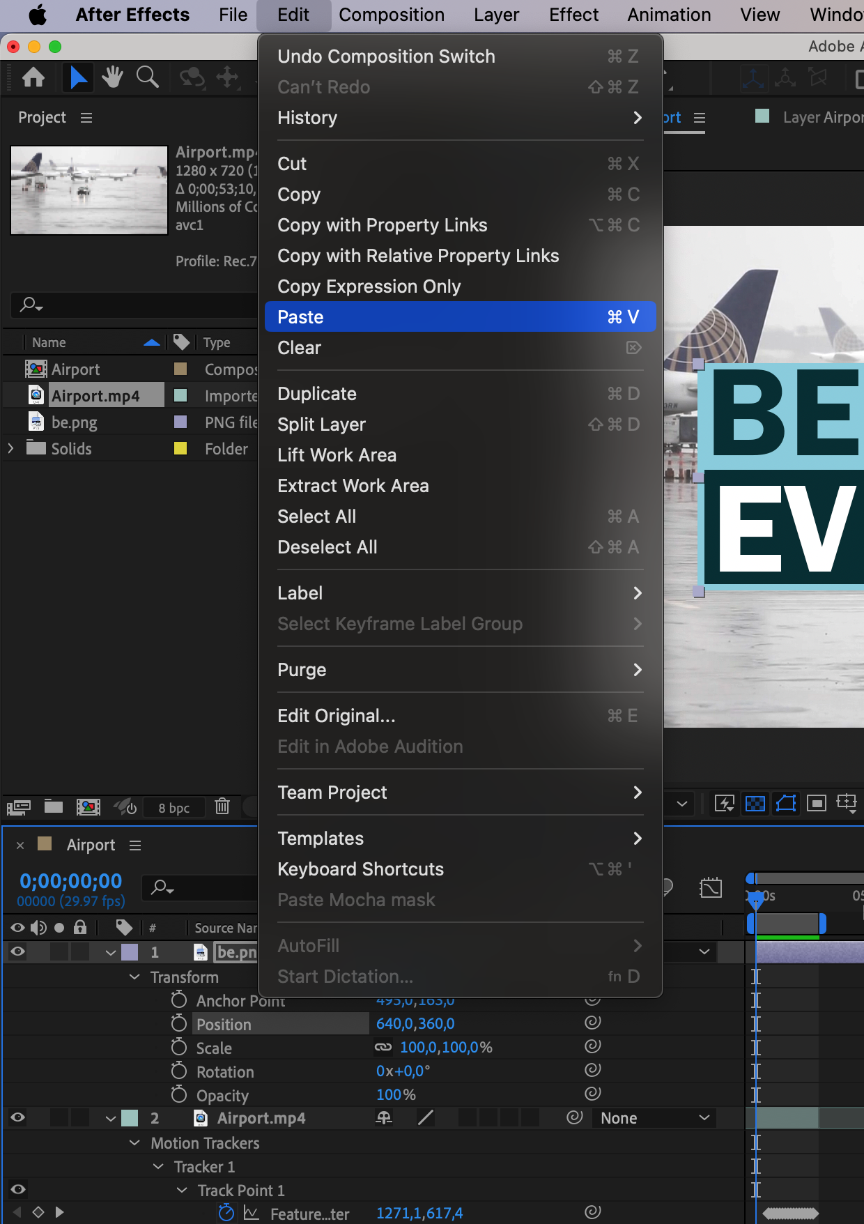 Expand the properties of your video layer, select the “Attach Point” property under Track Point 1, and copy it. Expand the layer with the image and paste it into the “Position” property. Additionally, adjust properties such as Scale and Anchor Point to fully cover the moving object on the video or position it as desired.