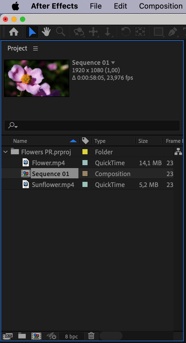 In the project panel, you’ll see the imported Premiere Pro project. Expand it to view the contents. Double-click on a composition to open it in the composition panel and start working.