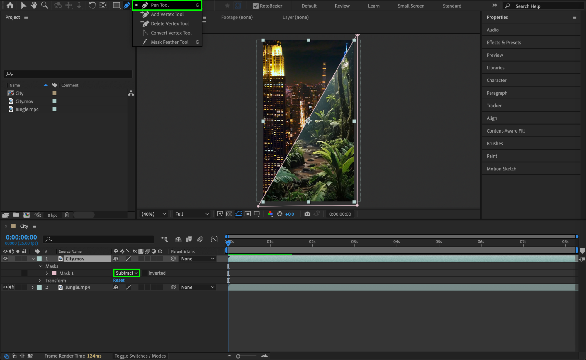 Click on the layer to activate it. Then choose the Rectangle Tool (Q), Ellipse Tool (Q), or Pen Tool (G) from the top toolbar. Draw a mask directly over the layer. In the Timeline panel, the mask will appear under the layer’s properties. Set the mask mode to Add (to reveal content) or Subtract (to hide content).