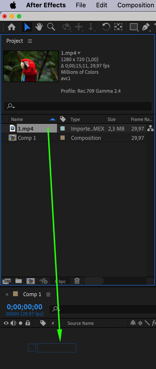 2. Create a composition, click on the “Create New Composition” button, and drag the necessary elements onto the composition panel.
