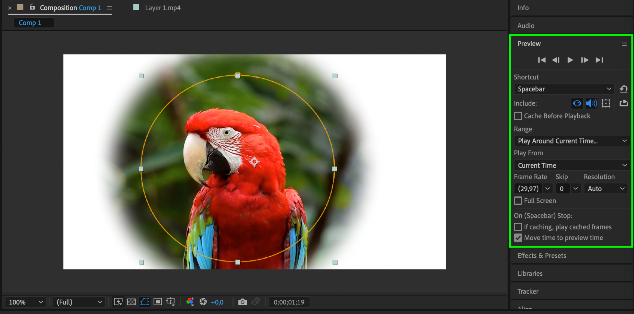 Press the spacebar to play/pause the preview. Use the RAM preview function to render a higher-quality preview of your composition.