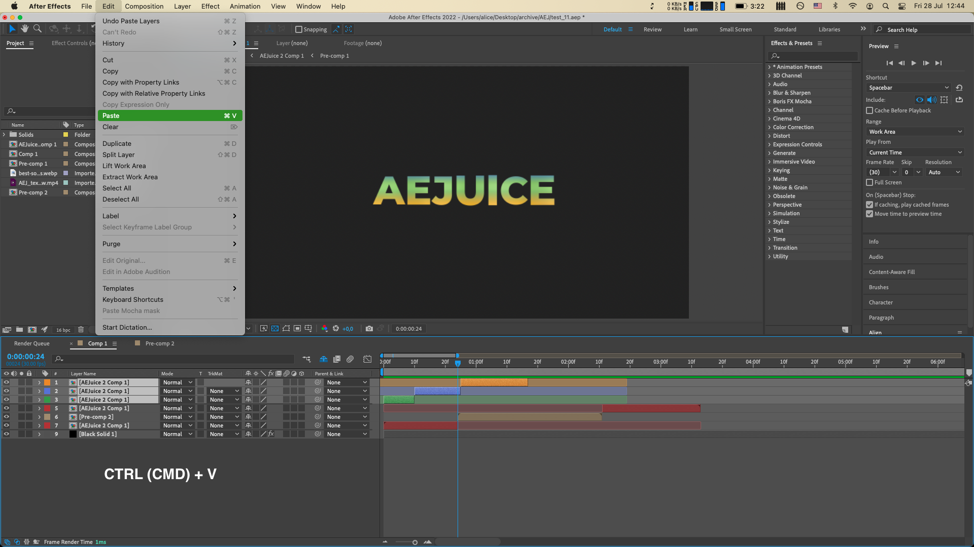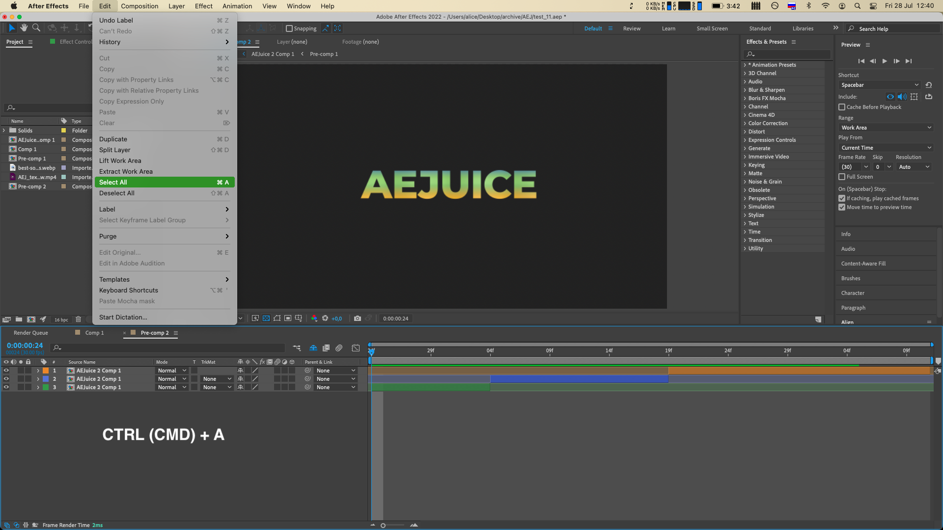 First, locate and select layers that you want to un-precompose in your project panel. Navigate to Edit > Select All or use hotkey CTRL (CMD) + A to select all the layers in the composition.