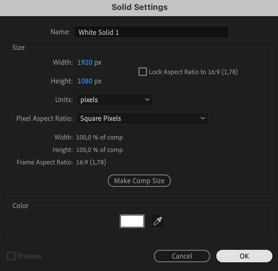 Select the solid layer and press “S” to open the Scale properties. Unlink the chain icon between the X and Y values. Set the X value to match the length of your text and adjust the Y value to control the thickness of the underline. Position the solid carefully under the text using the Position property.
