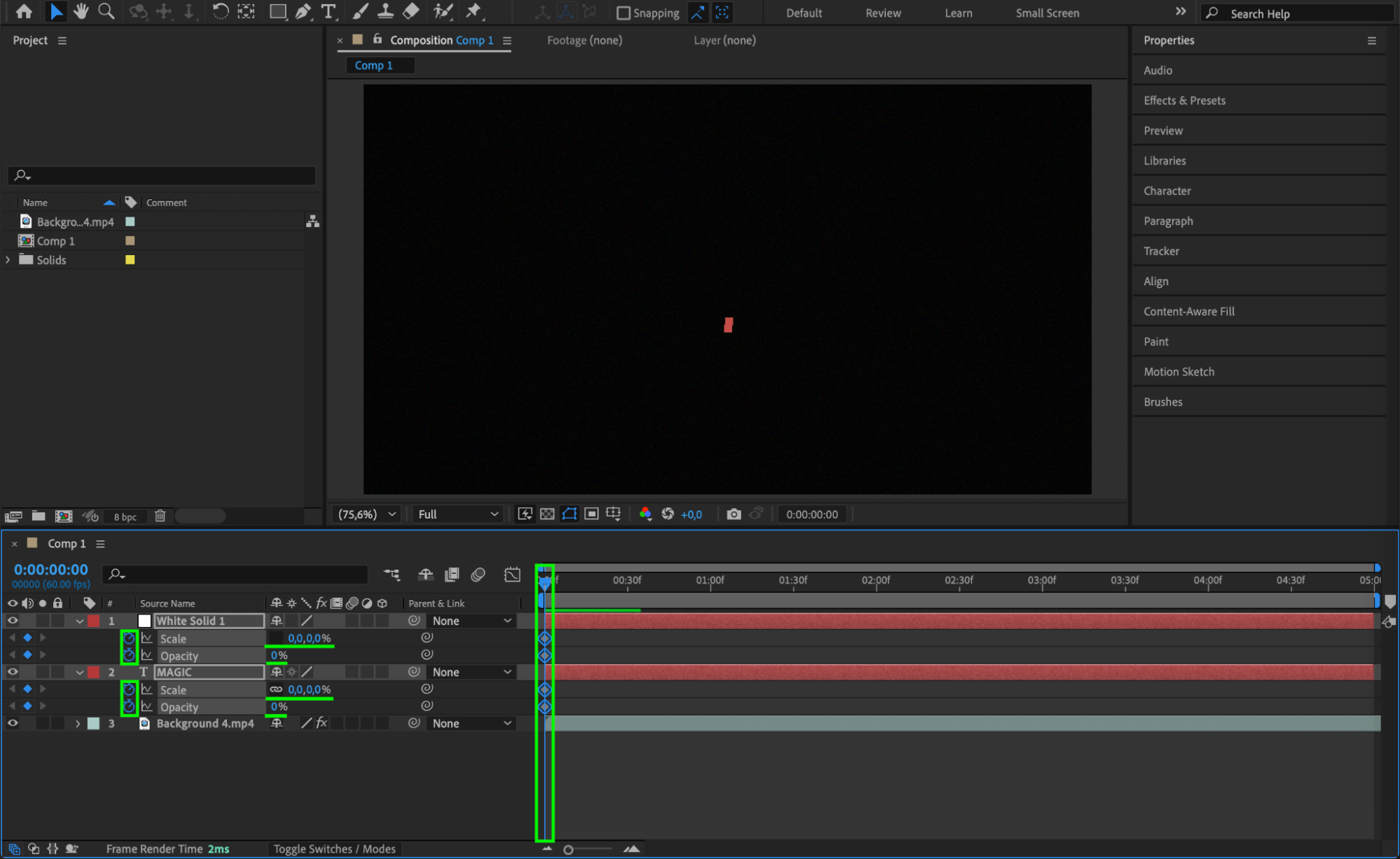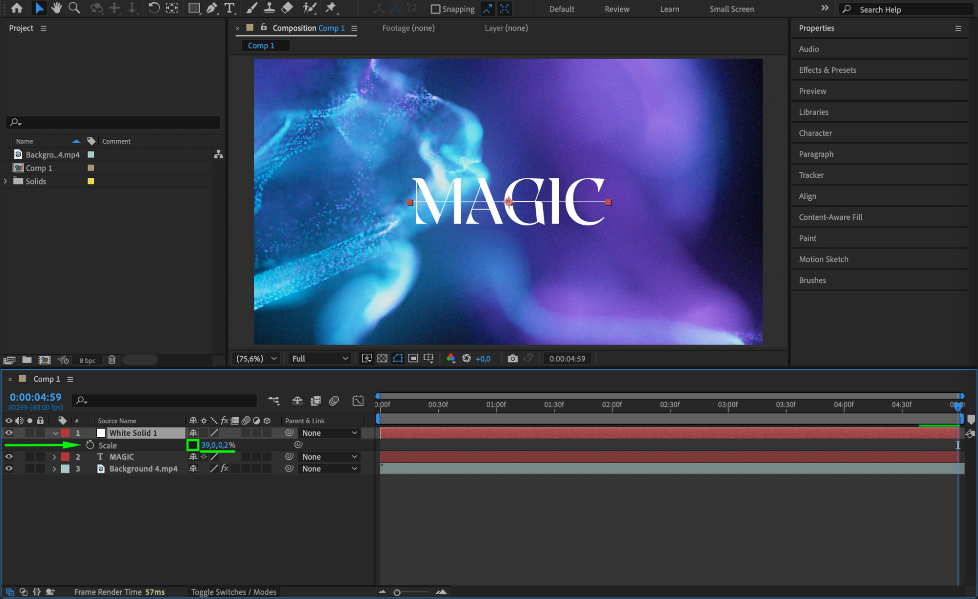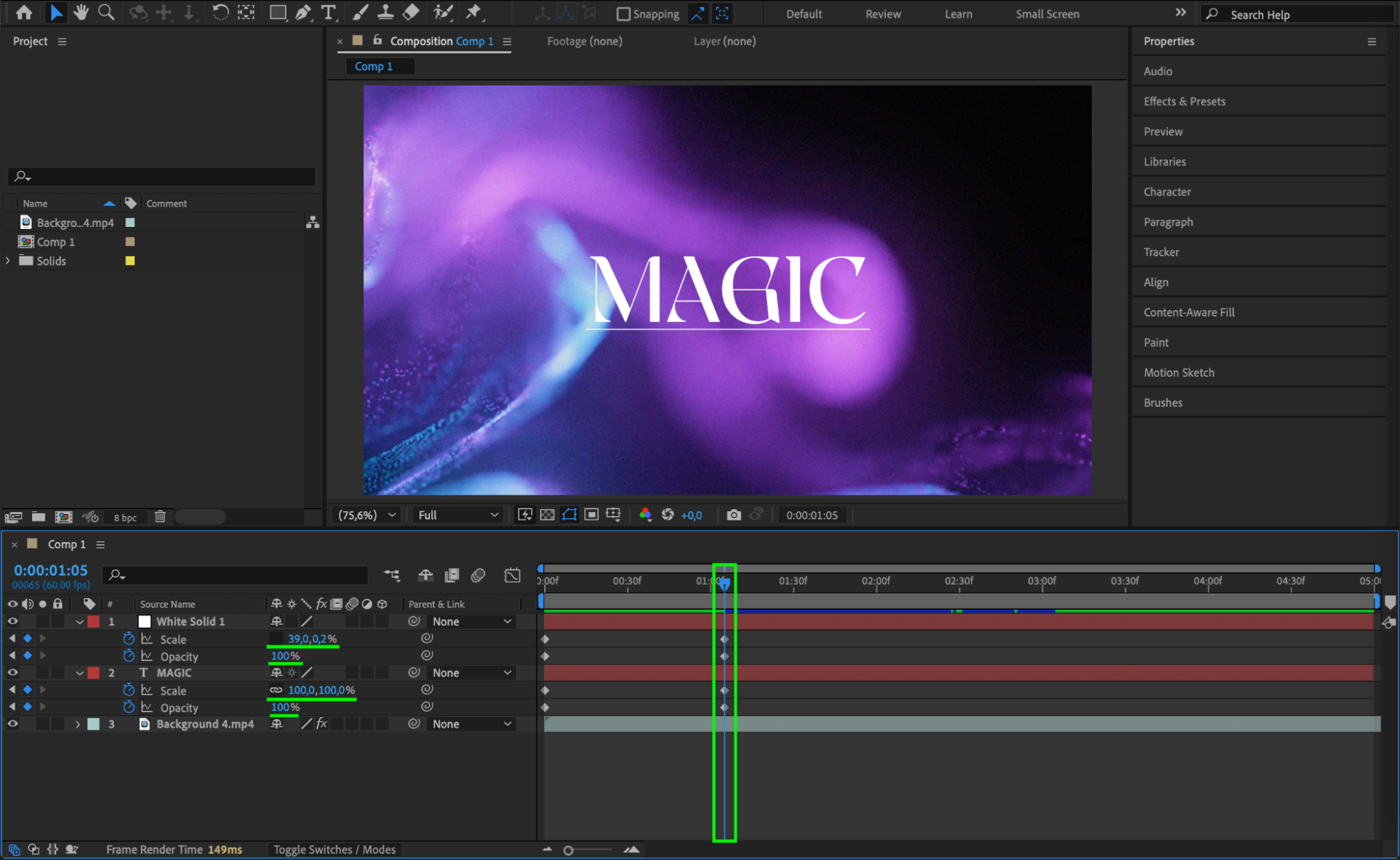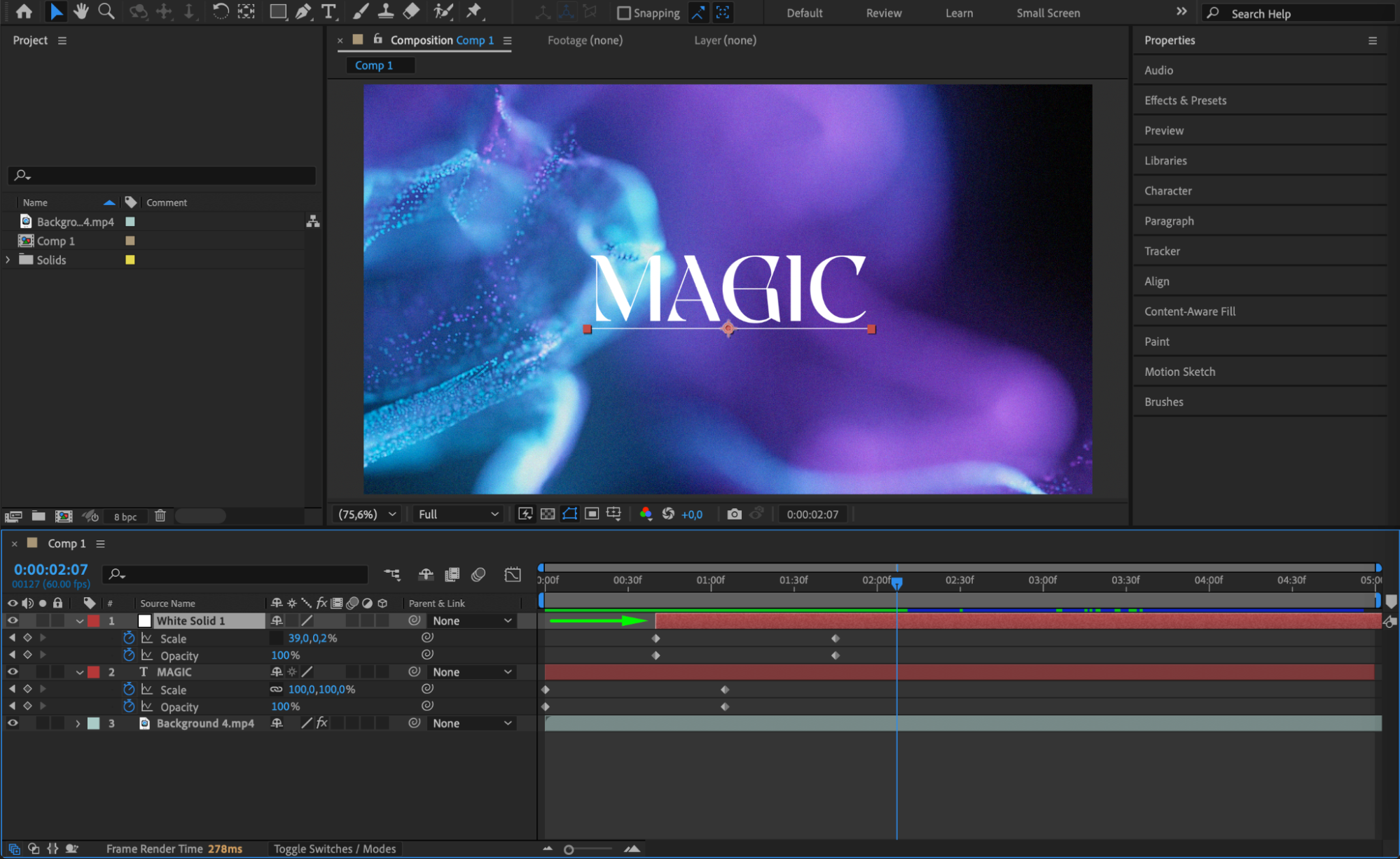 Animate the Scale and Opacity for both the text and the solid. Start with 0% for both at the beginning and animate them up to 100% over a few seconds. For the solid layer, use the customized X and Y scale values you set earlier. This creates a smooth reveal effect for both the text and underline.