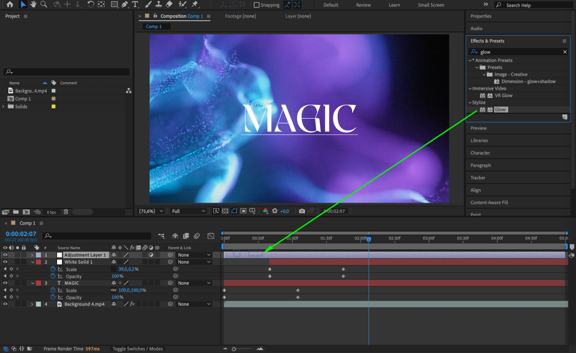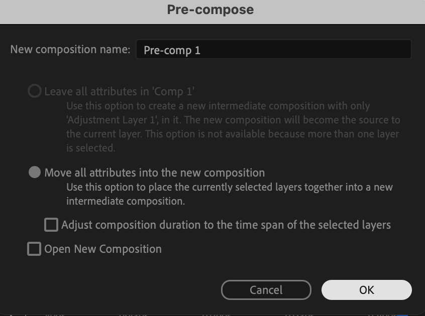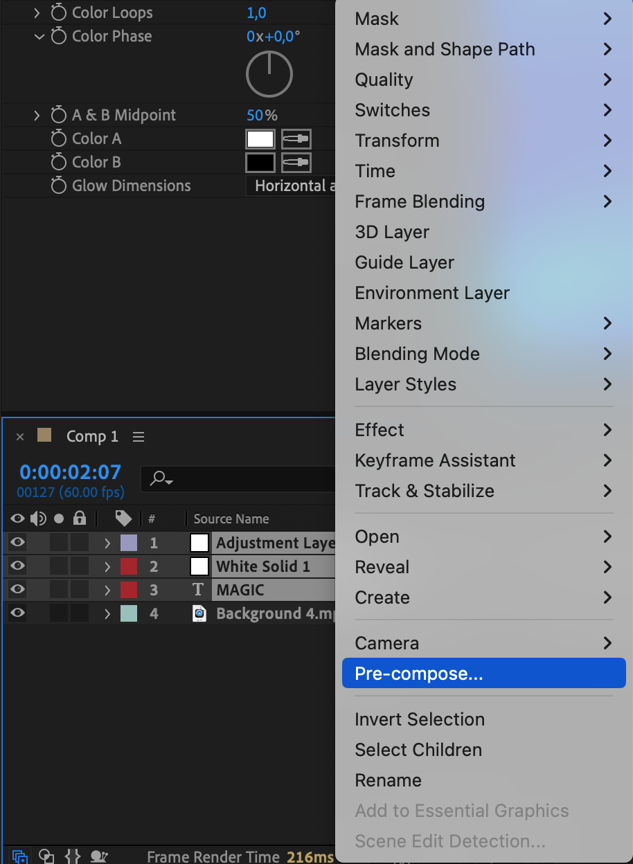 Select the text layer, solid layer, and adjustment layer. Then go to Layer > Pre-compose. This groups them into one layer, making it easier to move, duplicate, or apply additional effects without affecting the rest of your composition.