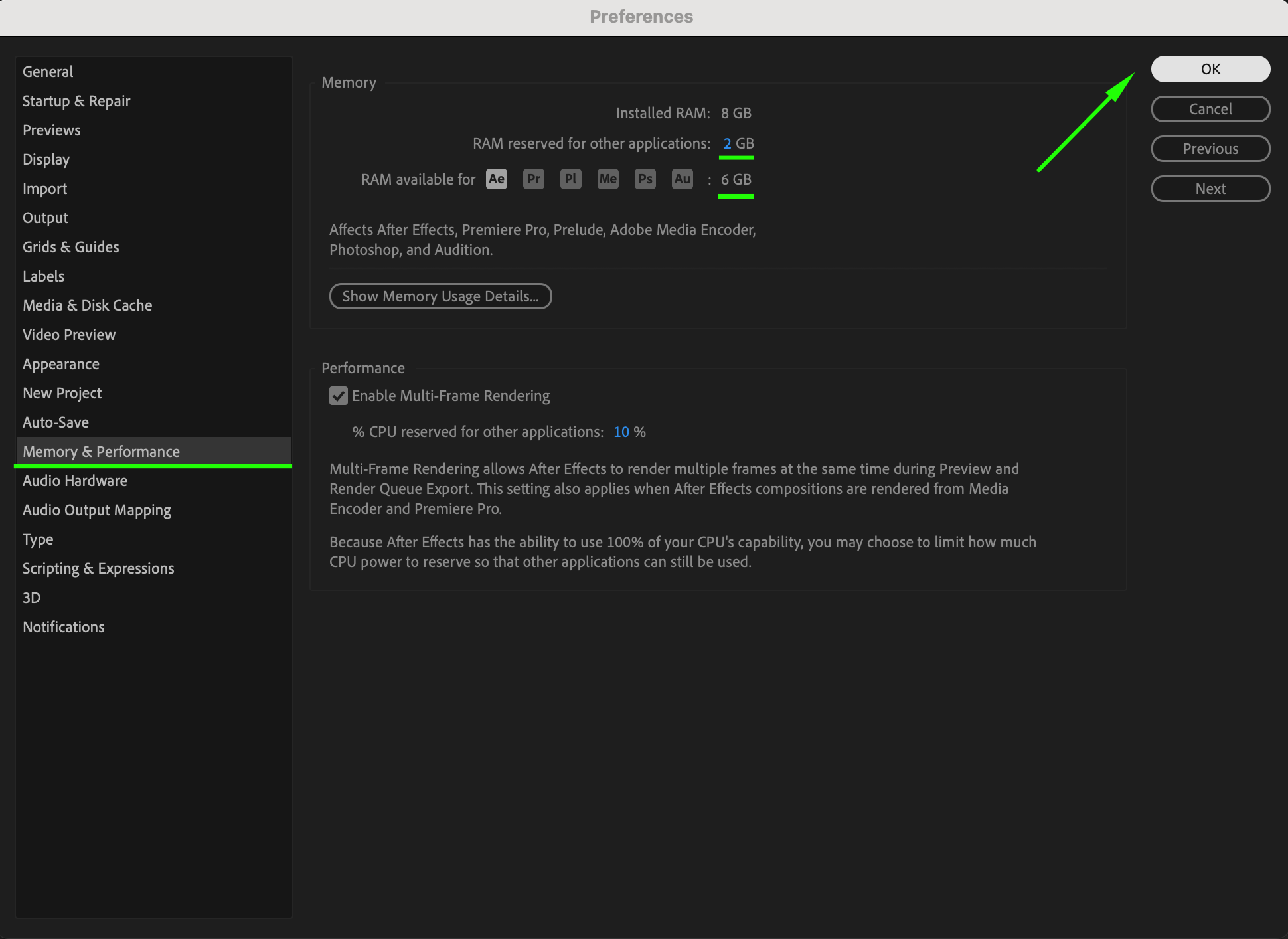 If you encounter issues where undo commands don’t function as expected, this may be due to memory limitations or preferences settings. Check Preferences > Memory & Performance (Windows) or After Effects > Settings > Memory & Performance (Mac) to ensure After Effects has sufficient allocated memory. Adjusting the RAM Reserved for Other Applications setting will change the RAM available for After Effects. Restarting After Effects or increasing available memory often resolves undo-related issues.