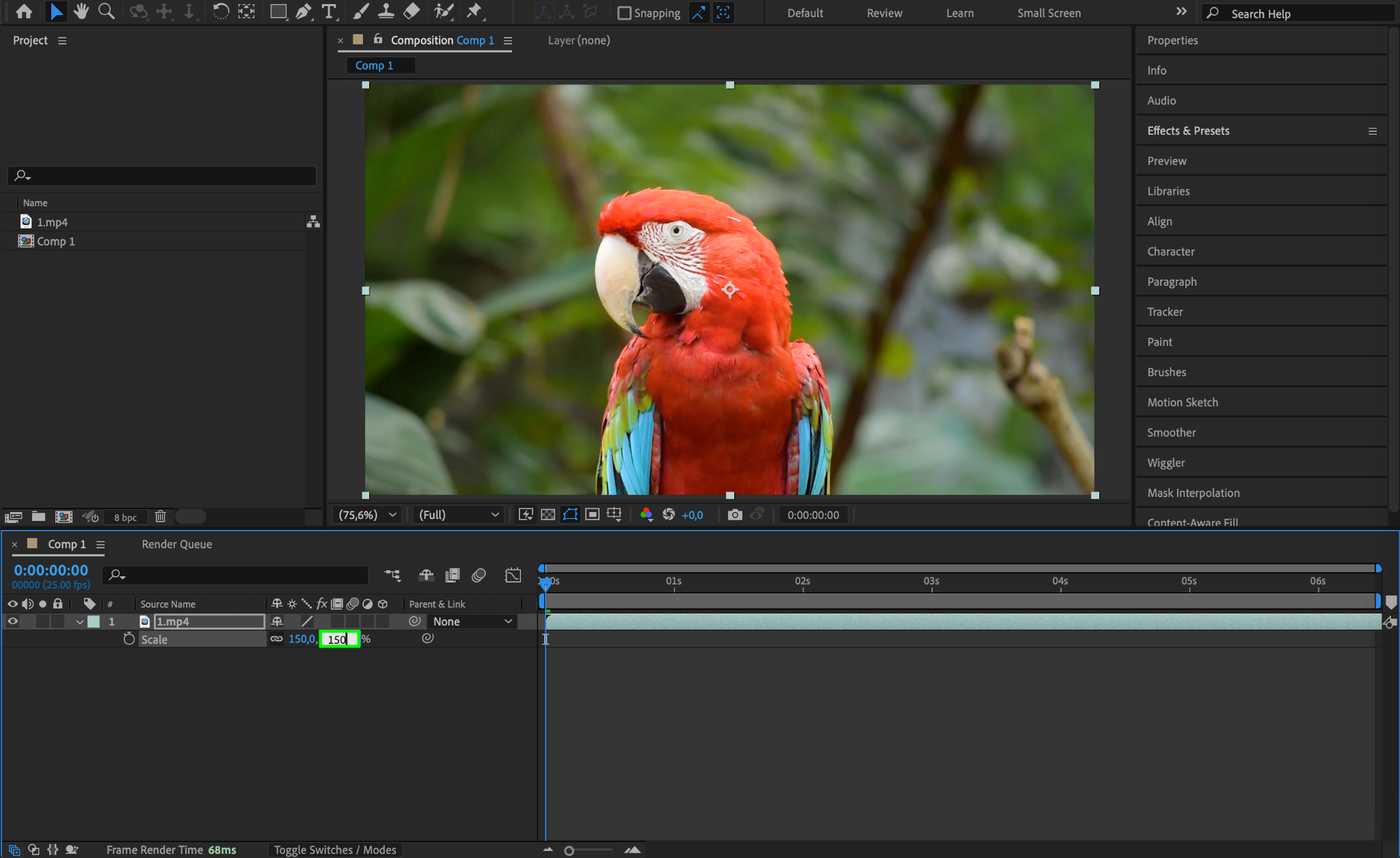 Select the footage layer in the timeline. Press S to bring up the Scale properties, and increase the value to match your composition’s resolution. Avoid scaling beyond 200% as it may introduce noticeable artifacts. This step sets the basic size but may not improve quality.
