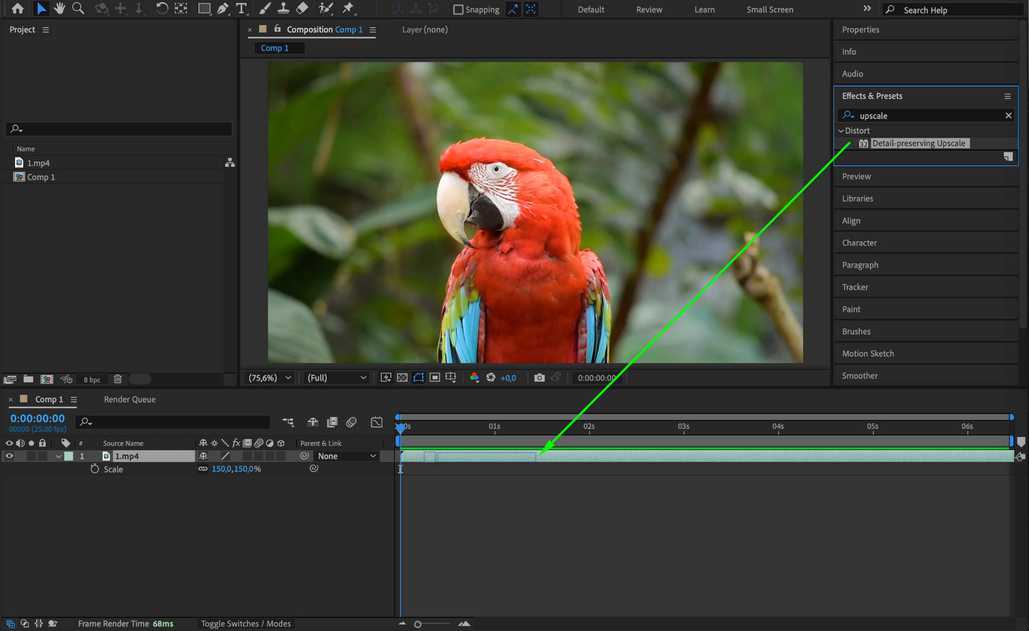 Navigate to Effects & Presets, search for the Detail-preserving Upscale effect, and apply it to your footage layer. This effect is specifically designed to enhance resolution while retaining detail. Adjust settings like Scale Percentage and Reduce Noise to optimize the upscale.
