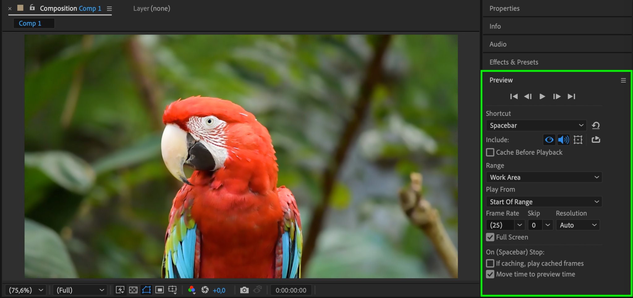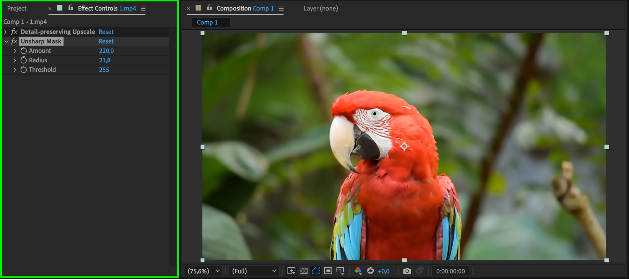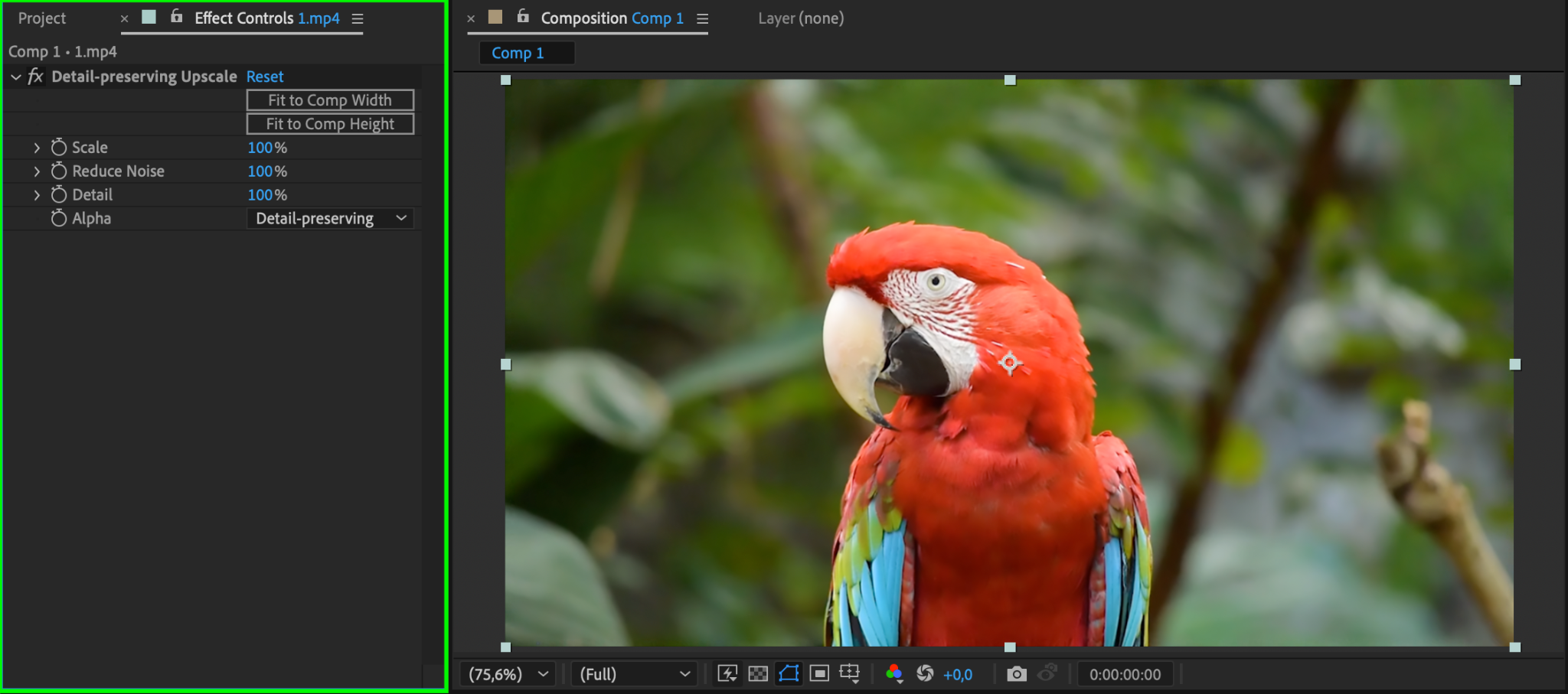 Preview your footage by playing it back in the composition. Make adjustments to effects like scaling, noise reduction, or sharpening as needed to achieve the best possible quality.