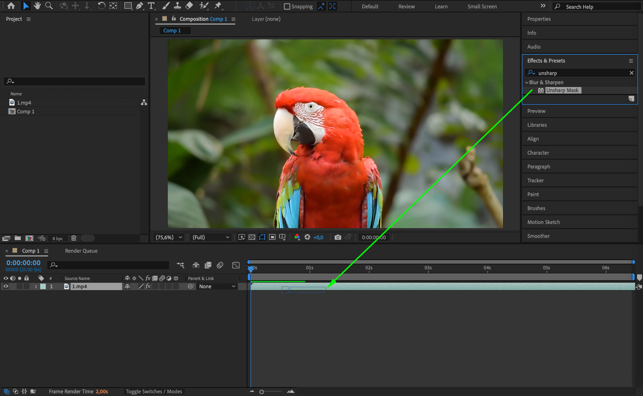 After upscaling, you may notice noise or softness in the footage. Apply Unsharp Mask or Sharpen effects from the Effects & Presets panel to enhance edges and details. Use a noise reduction tool like Reduce Grain to clean up any artifacts introduced during upscaling.