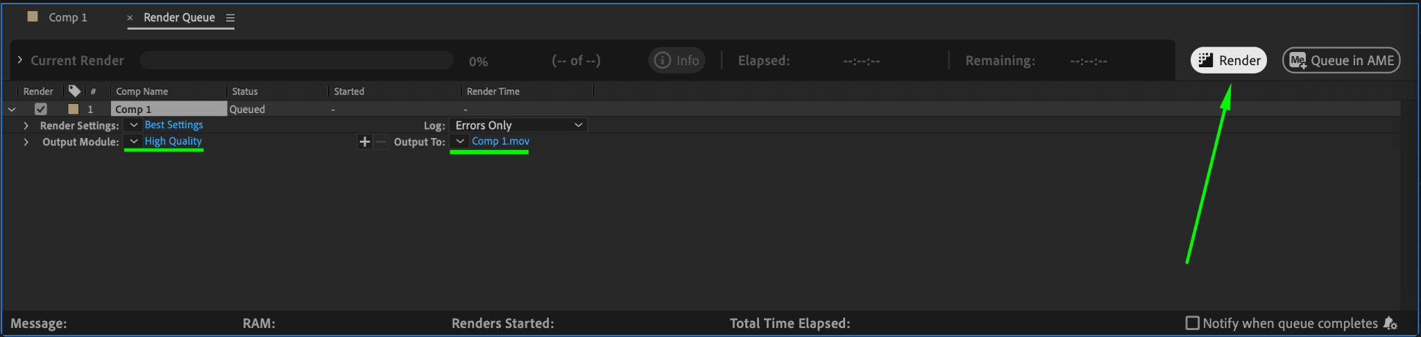 Once you’re satisfied with the results, export your project. Go to Composition > Add to Render Queue, select the desired output format (e.g., H.264 for video), configure resolution settings to match your composition, and click Render.
