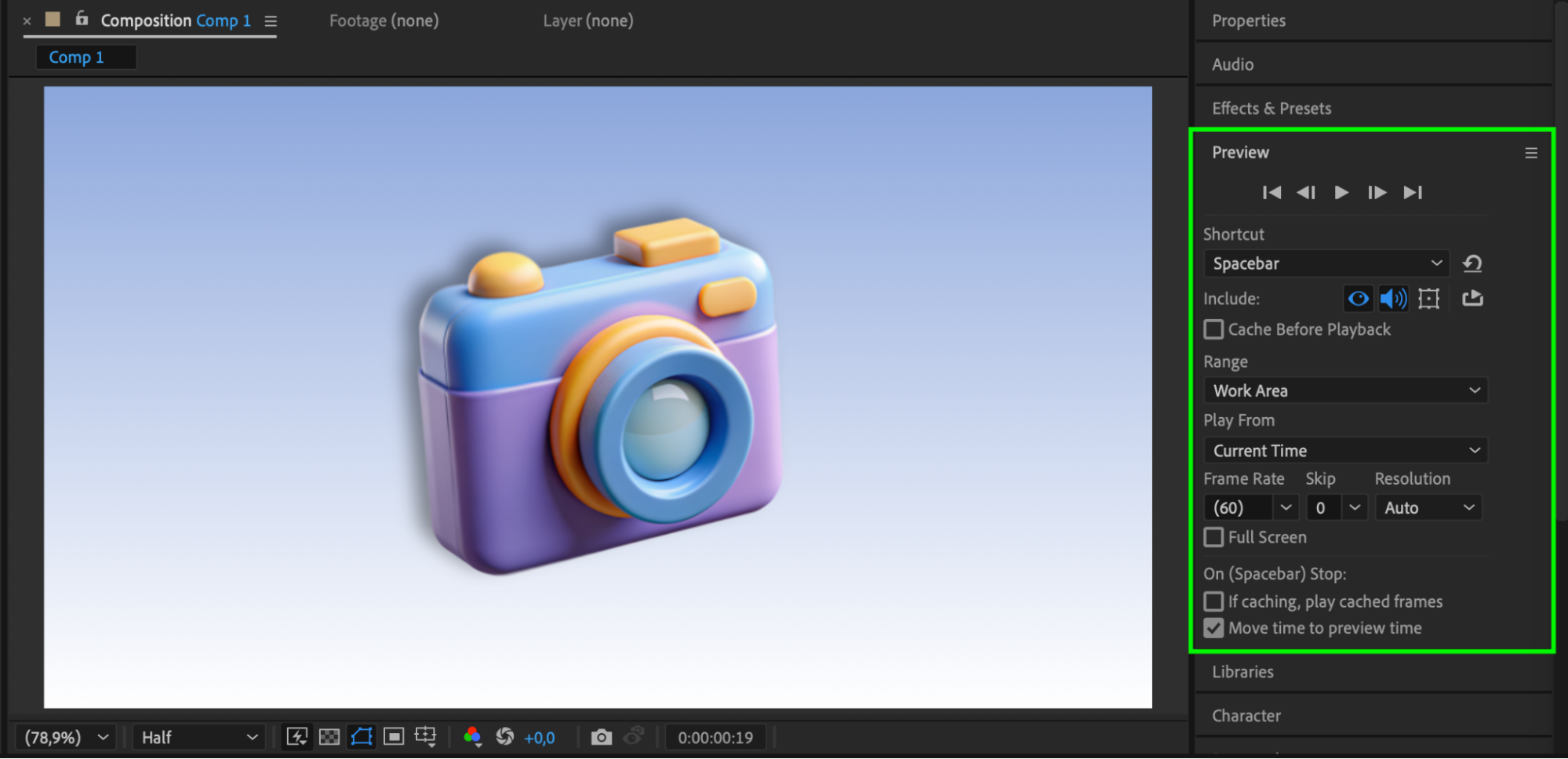 Press Spacebar to play your timeline and preview the result. Check how the animation moves and blends with the rest of your design. Make any necessary adjustments using the Edit panel or timeline markers.