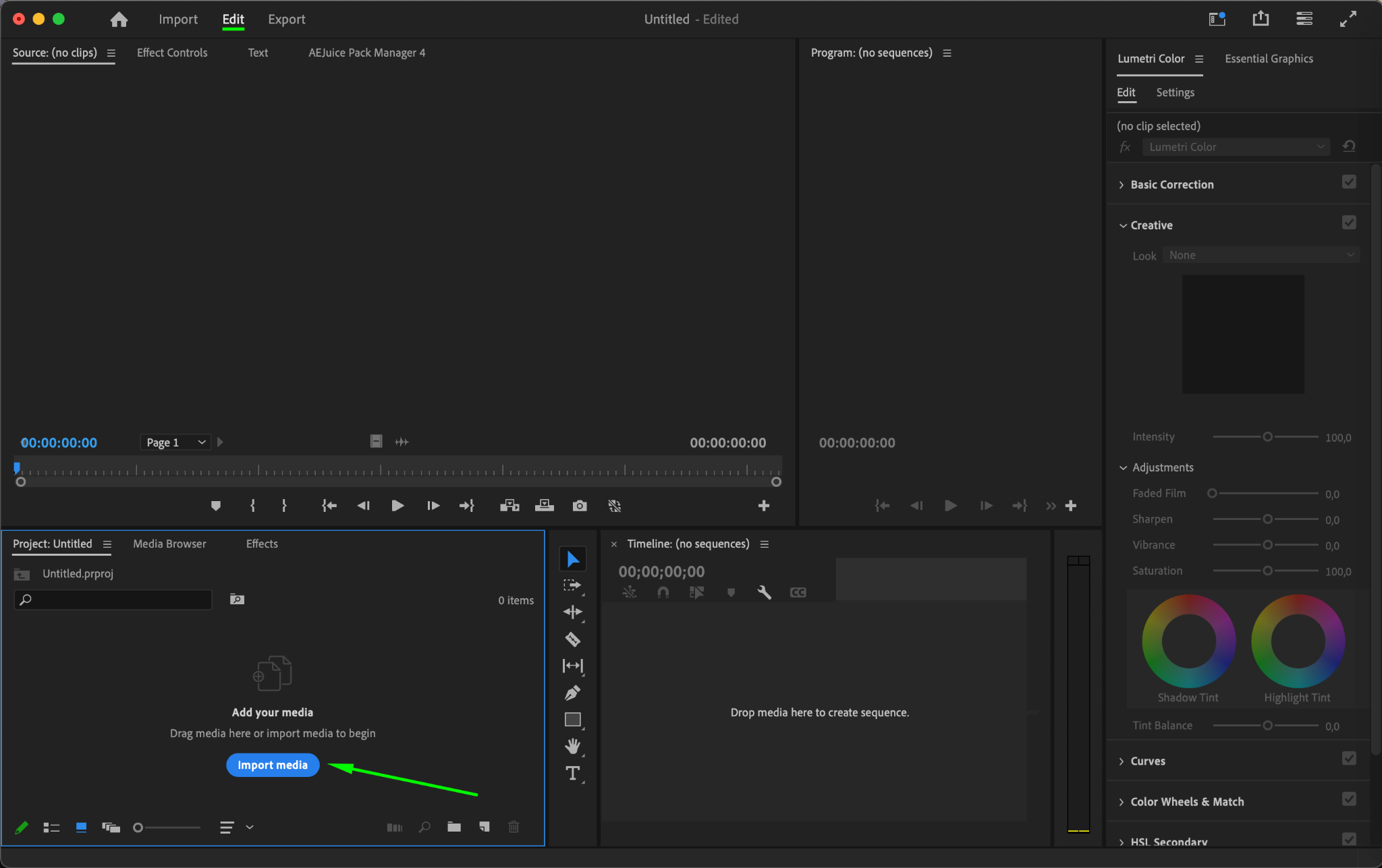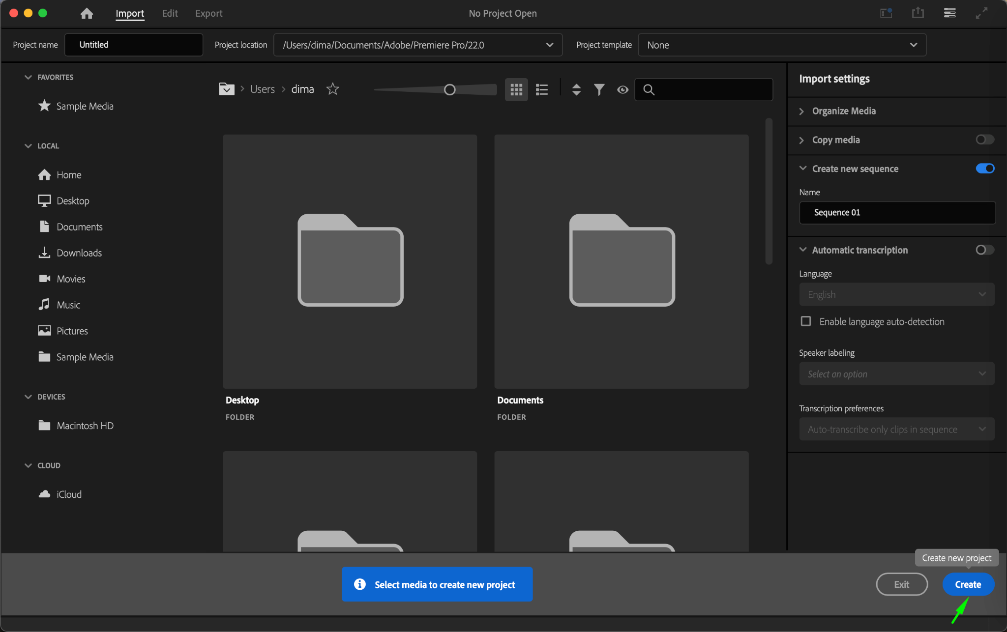 Launch Premiere Pro and create a new project by clicking on the “Create” button at the bottom of the startup screen. This step ensures that you have a fresh workspace ready for importing your After Effects composition.