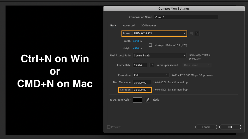 - Click on the New Composition button in the right column of the Welcome screen, or use the keyboard shortcut Ctrl + N on Win or CMD + N on Mac. In the Composition Settings window that appears, select UHD 8K 23.976 under the Preset drop-down menu and set the Duration to the desired length for your composition.