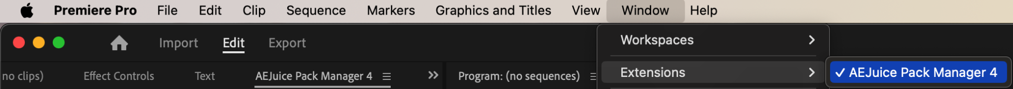 Go to the top menu and click Window > Extensions > AEJuice Pack Manager 4. This will open the plugin panel where you can access all AEJuice packs you own or want to install.