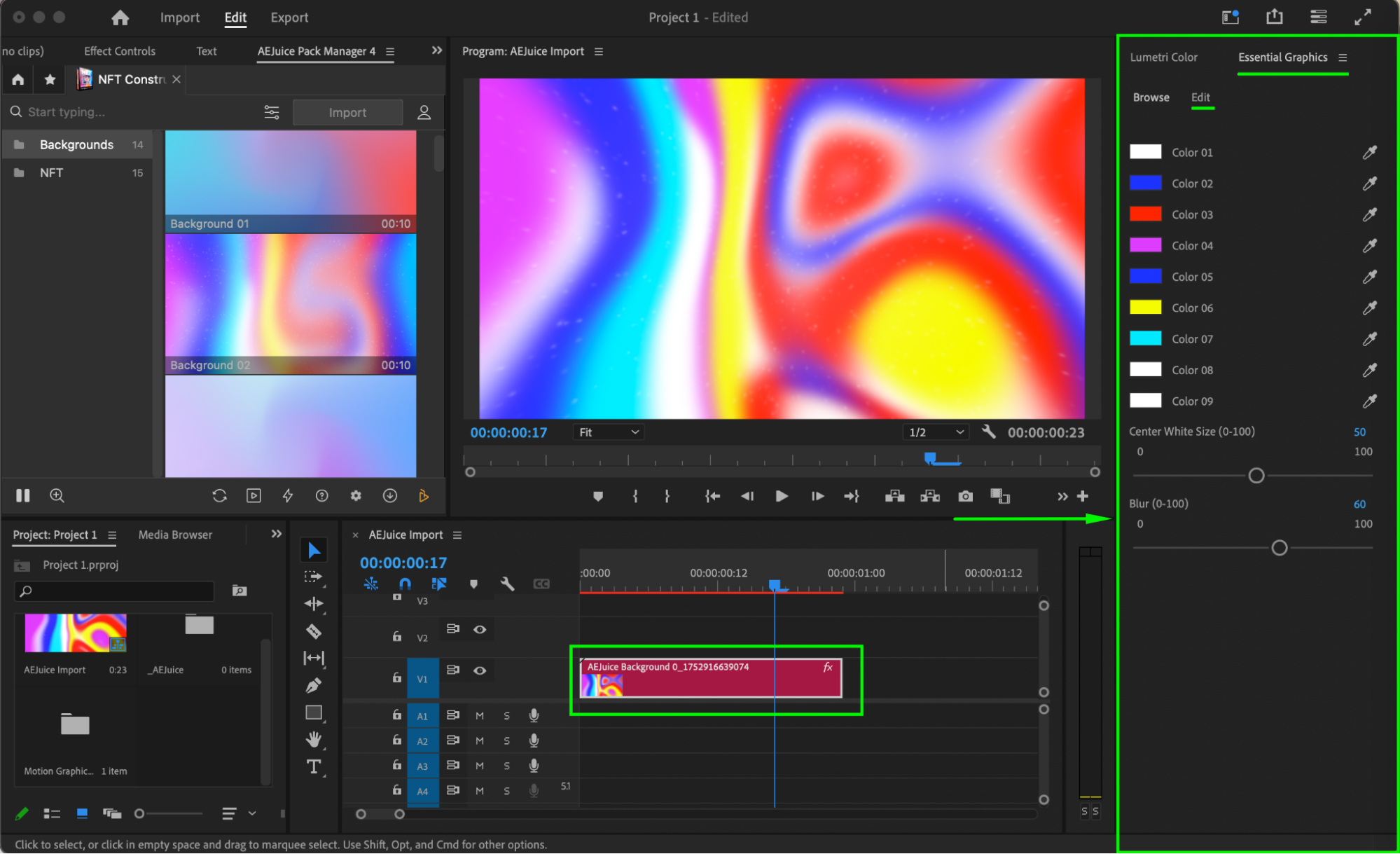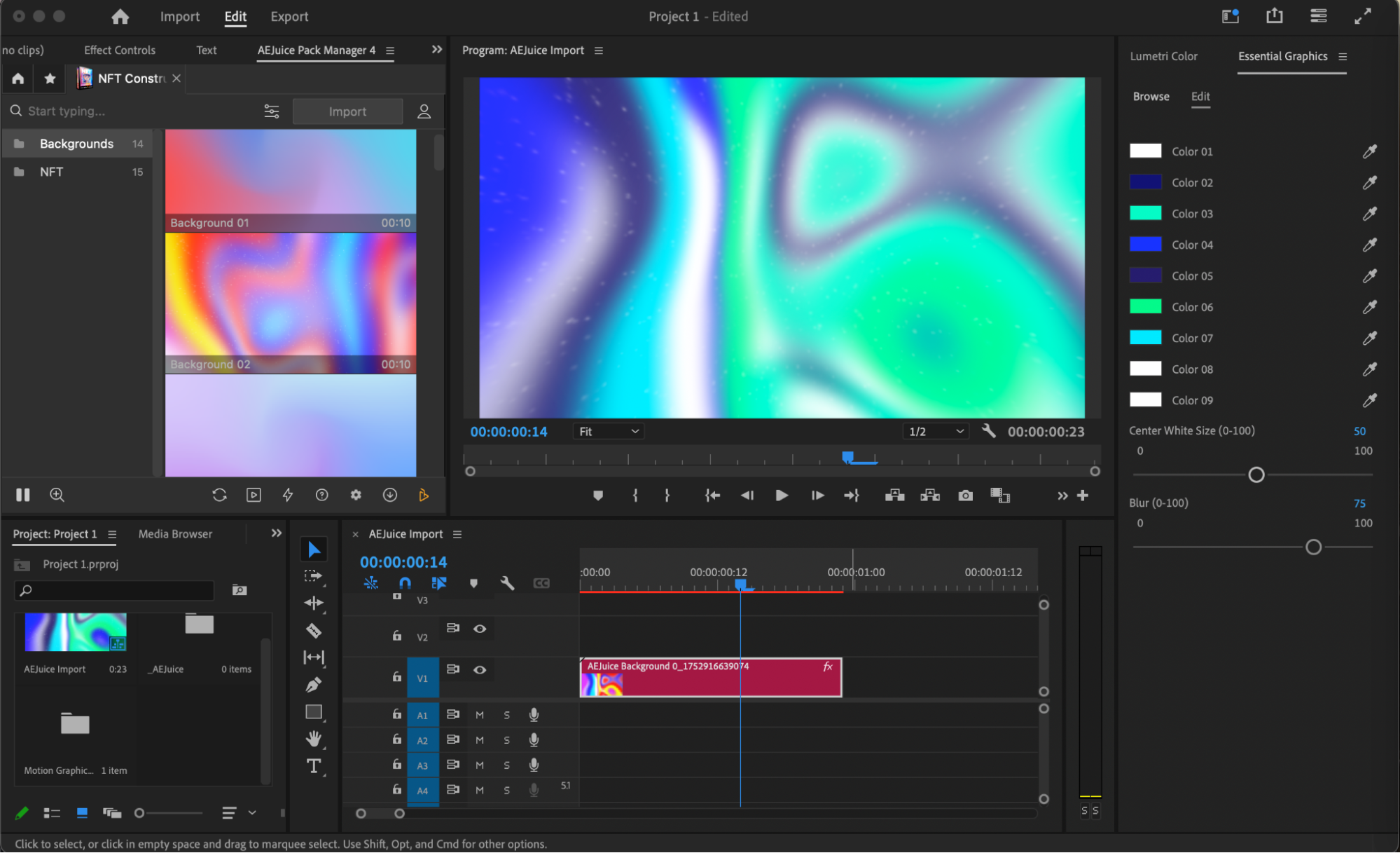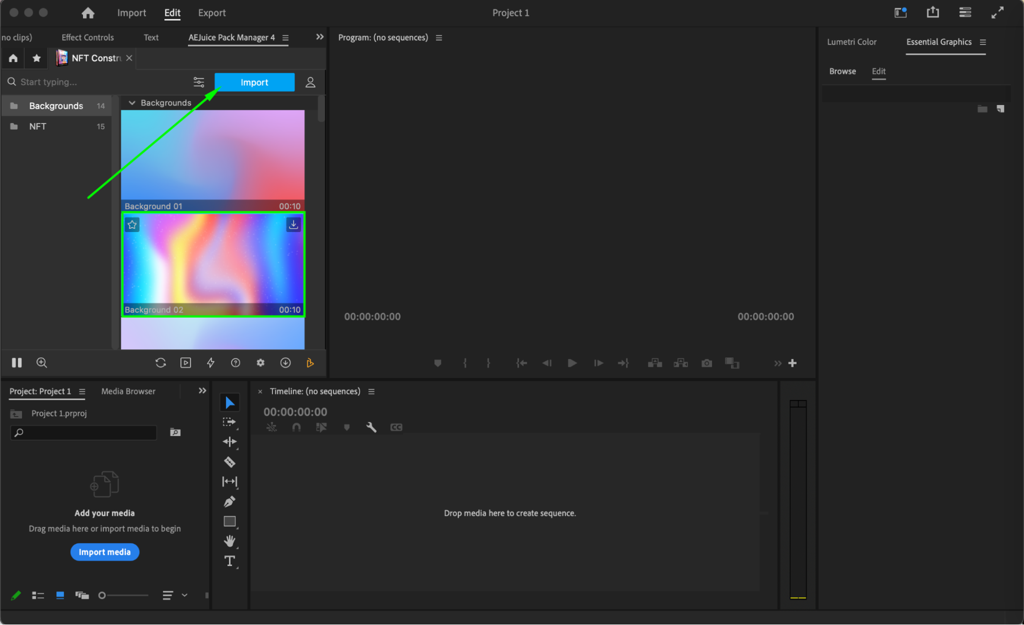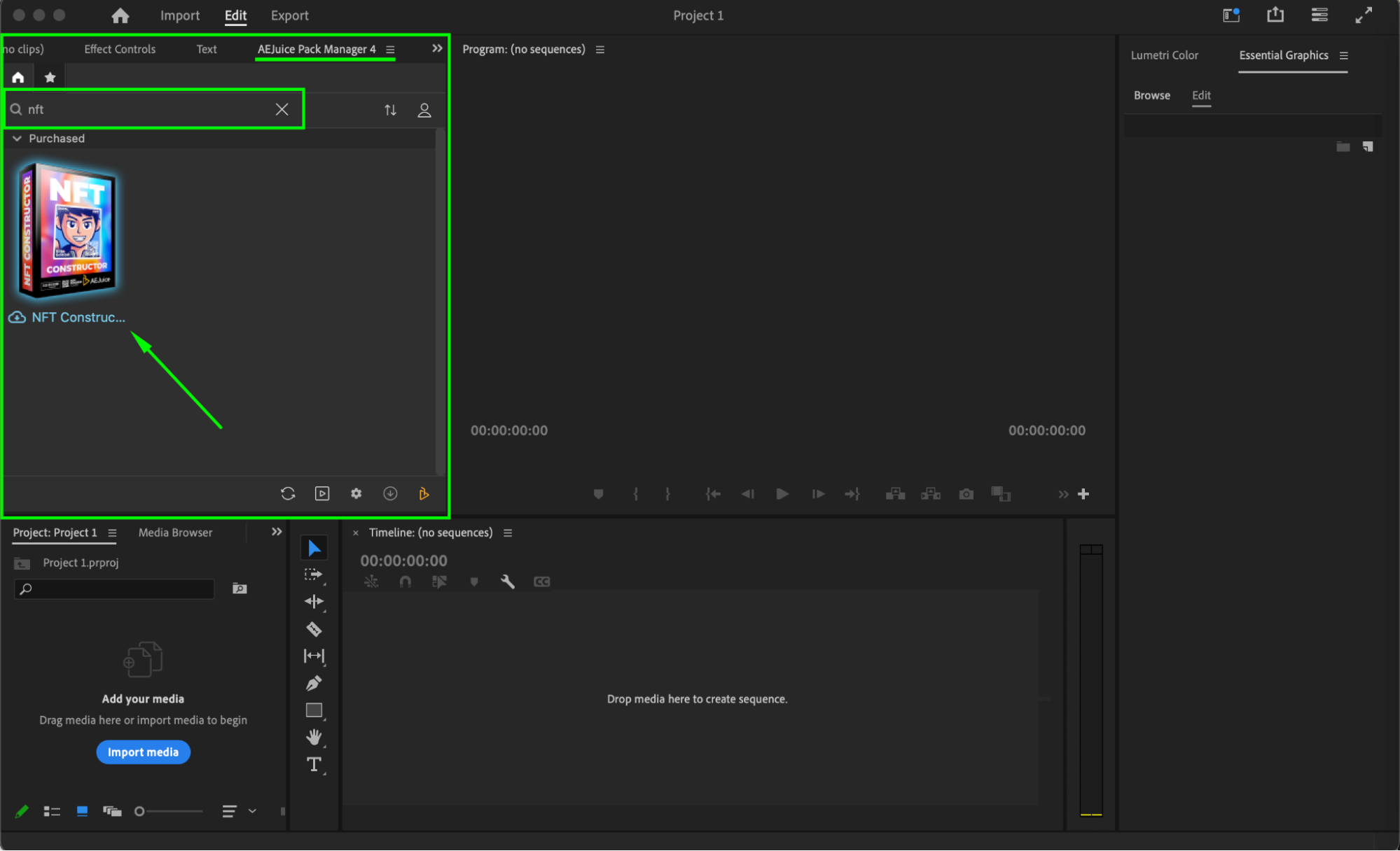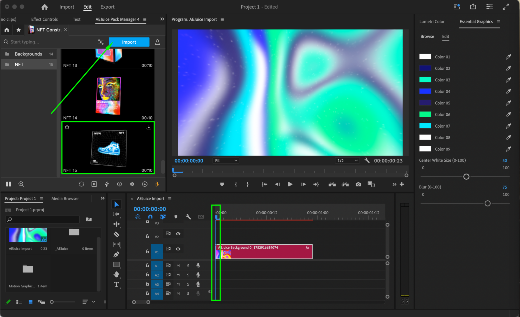 Inside AEJuice Pack Manager, scroll or search to find the NFT Constructor pack. Click on it to open. If it’s not installed yet, you’ll see a download button. Click it and wait for the pack to install. Step 4: Import a Background