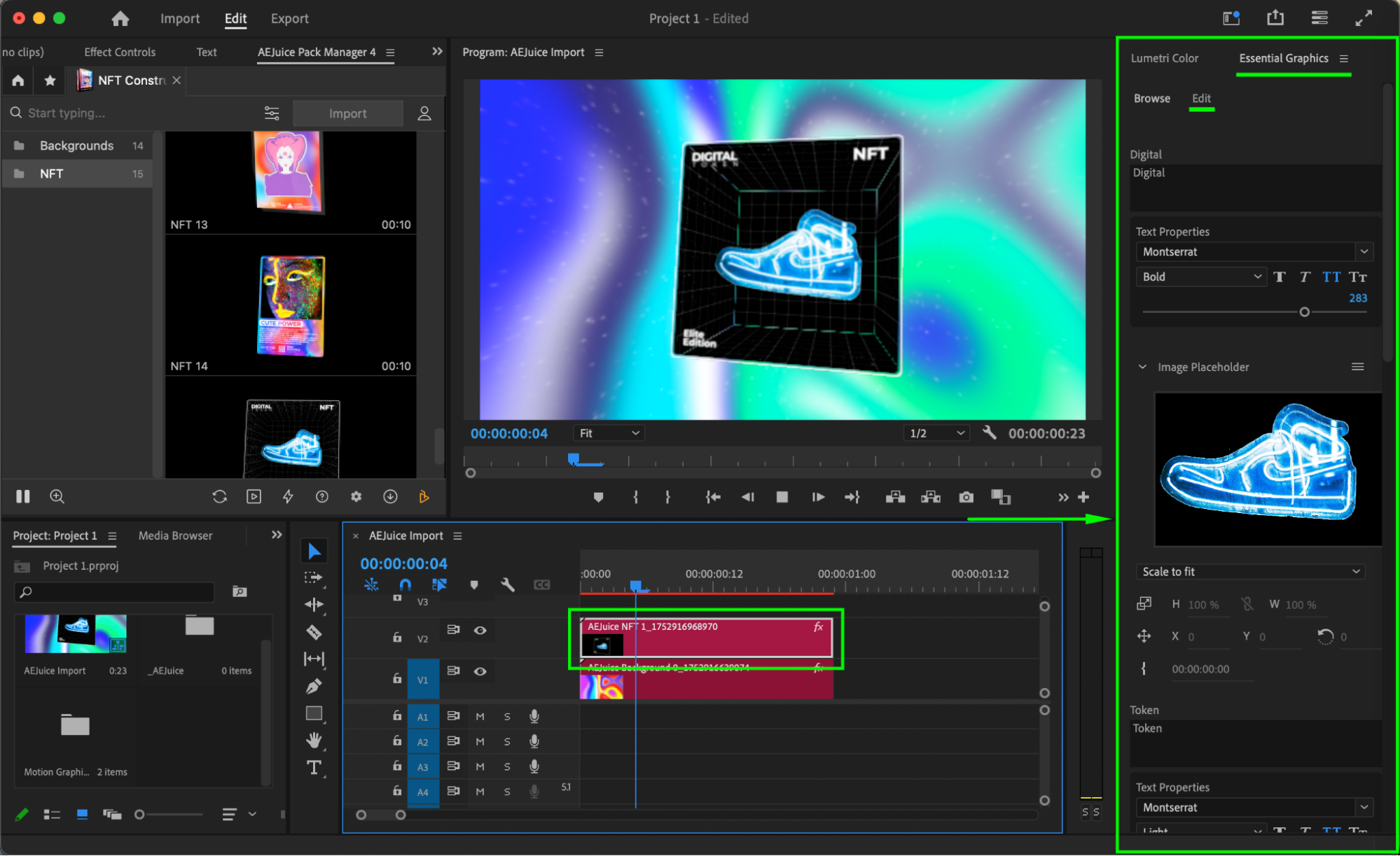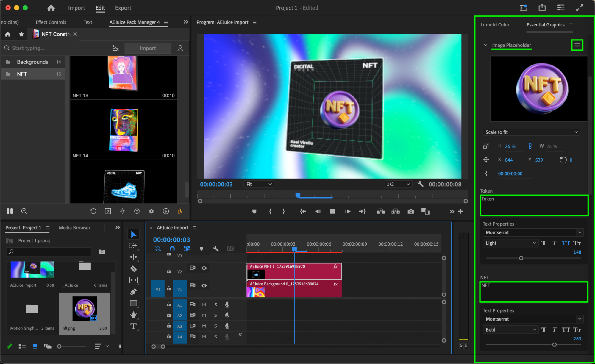 Learn how to create crypto-style visuals using NFT Constructor templates in Premiere Pro with AEJuice Pack Manager.