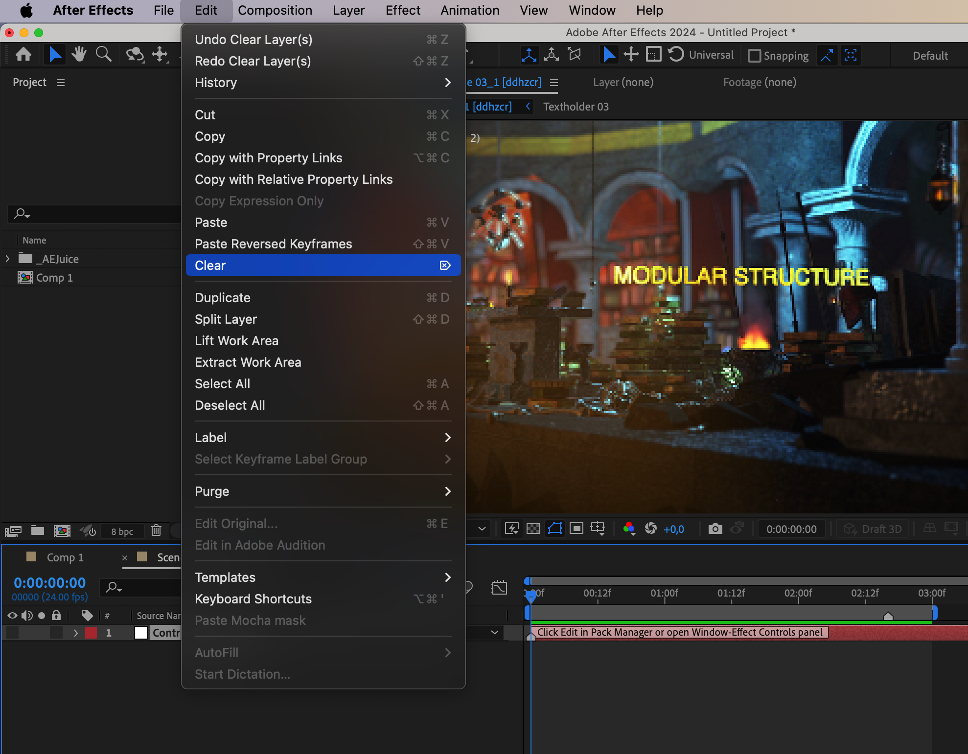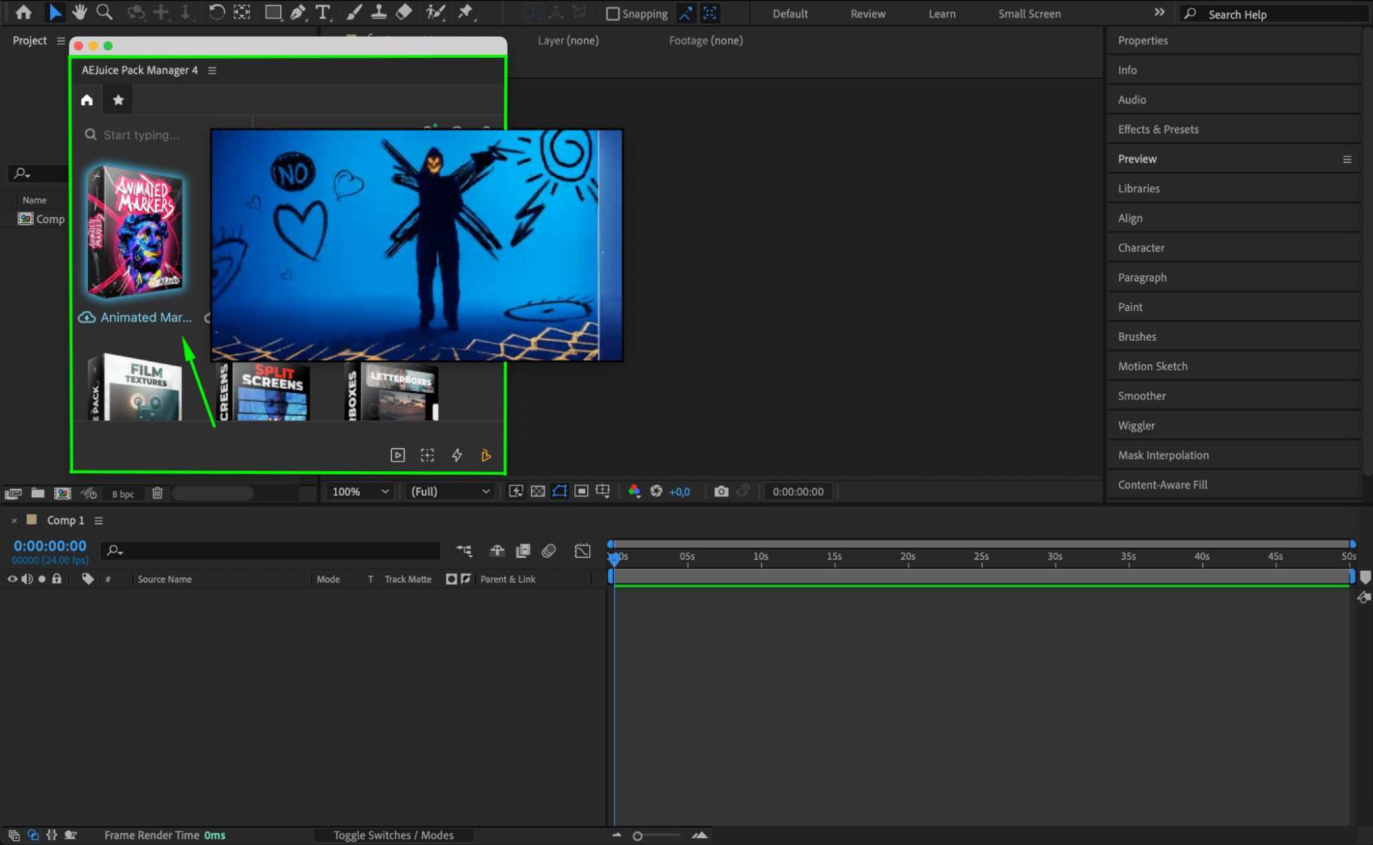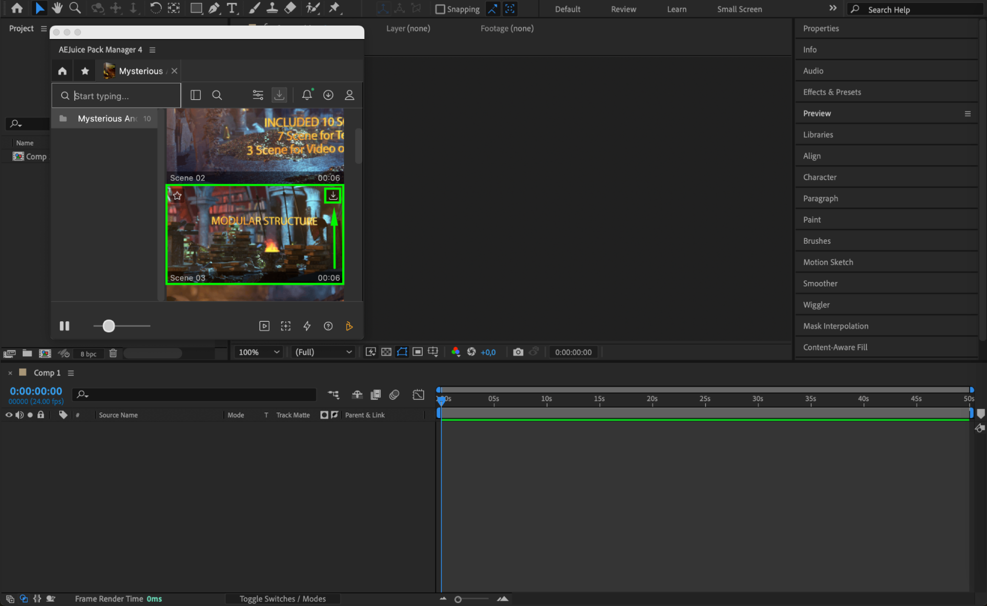 After choosing the effect or preset you need, download it, and it will appear as a layer in your timeline, ready for editing. Combine your footage, After Effects tools, and the power of AEJuice or other plugins to achieve the desired results.